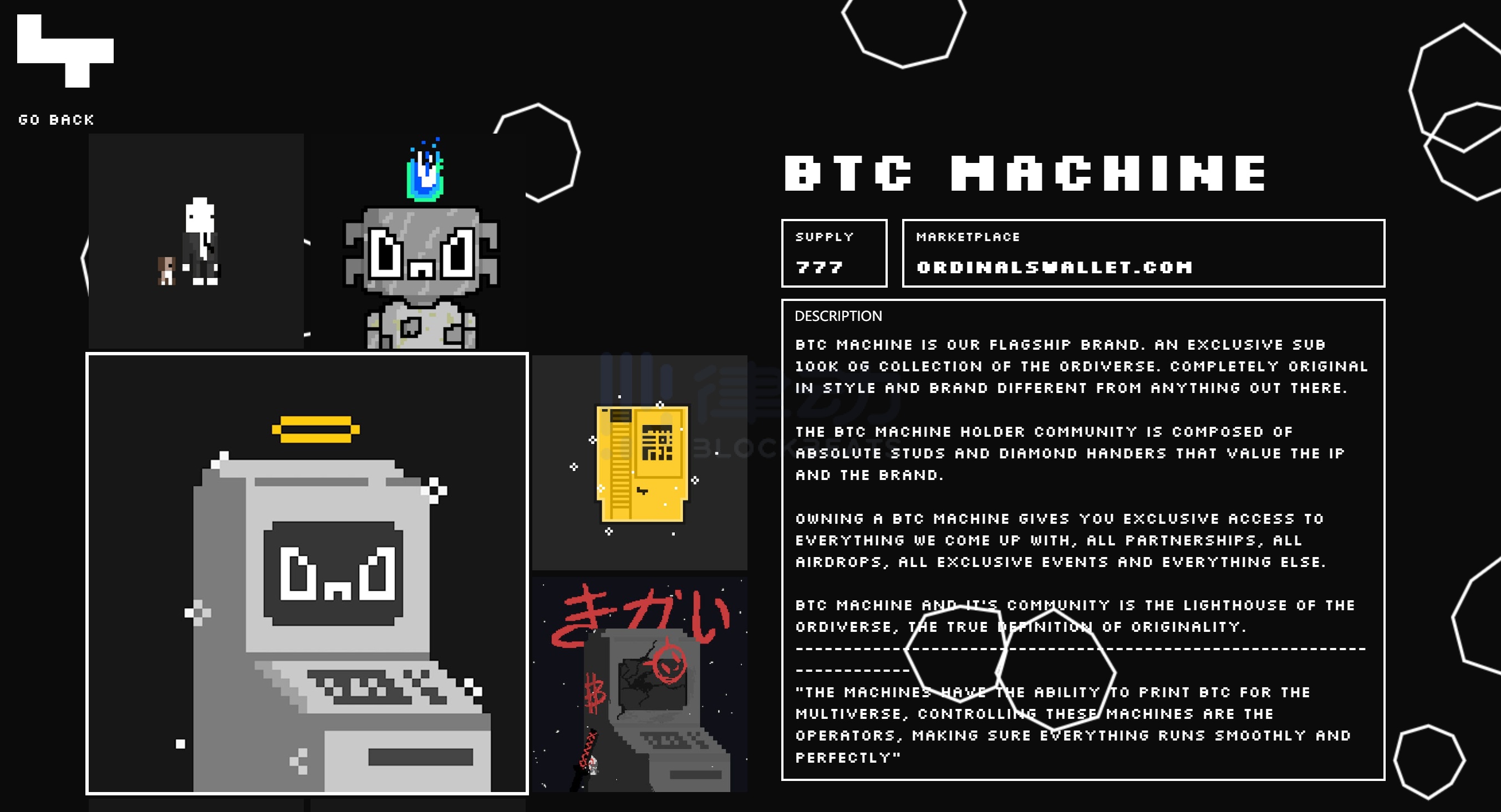 指持有后不断获得有价值的空投的 NFT 系列。目前比较出名的「铲子」是 BTC Machine,他们已经后续空投了 BTC Operators 与 BTC Virus 两个项目。目前,BTC Machine 在 Ordinals Wallet 市场上的地板价为 0.088 BTC,BTC Operators 与 BTC Virus 的地板价则分别为 0.018 BTC、0.0012 BTC。