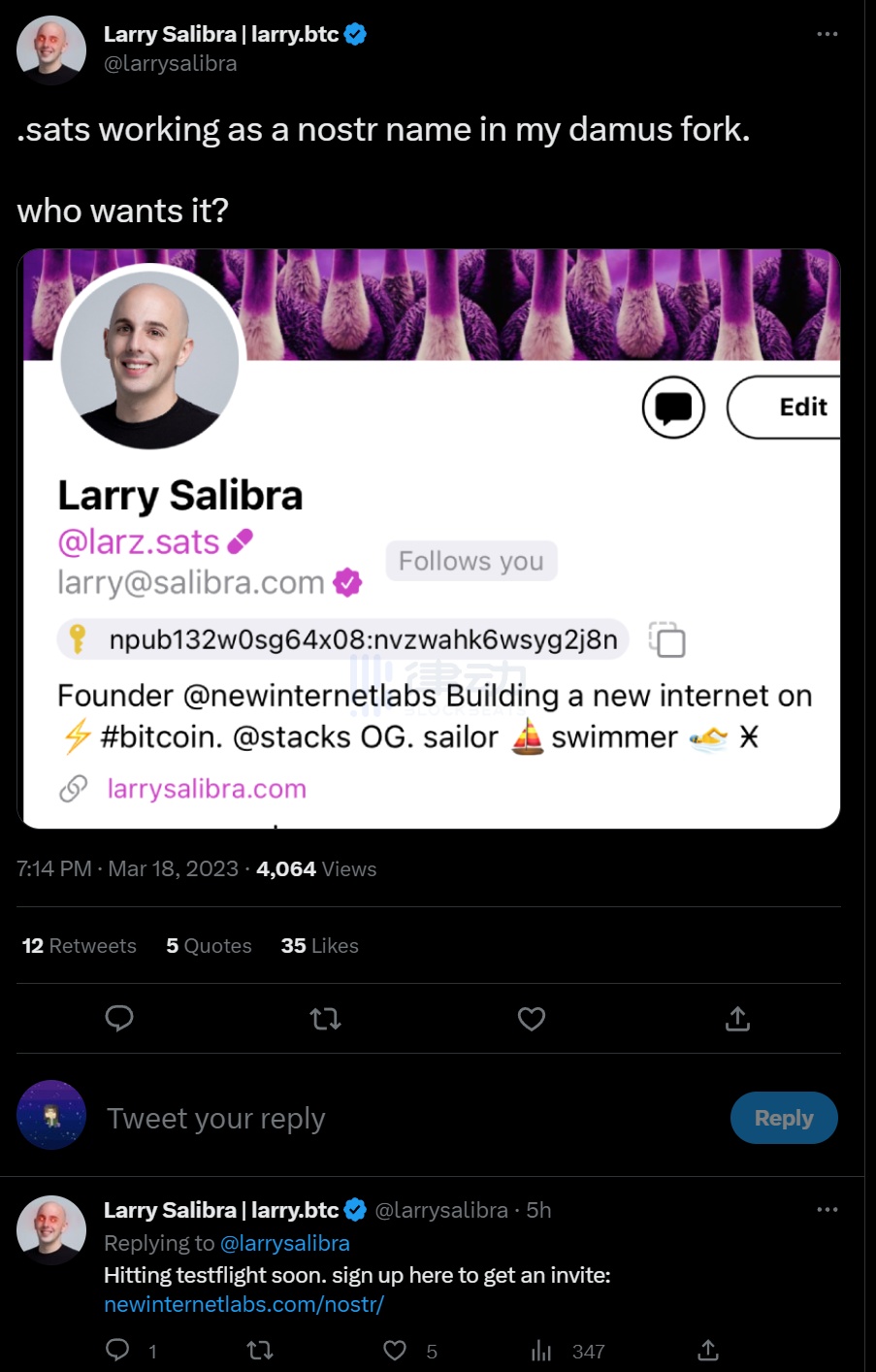 又比如,基于去中心化社交协议 Nostr 的首个社交应用「Damus」即将支持以 .sats 域名作为用户名。