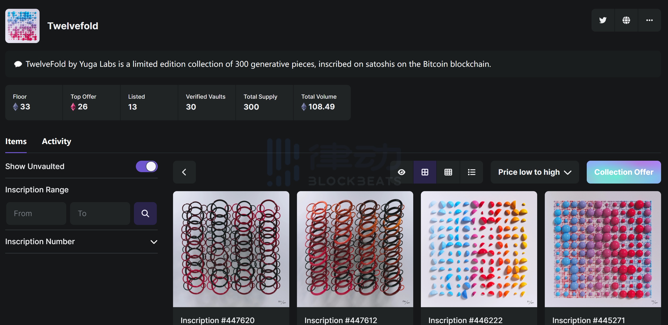 这类项目已经具有很大的影响力,因此发售价格也都很高。Yuga Labs 的「TwelveFold」以竞拍的形式出售了 288 个 NFT,最高中标价为 7.1159 BTC,最低中标价为 2.2501 BTC,共获得拍卖收入约 1650 万美元。目前,在 ordinals.market 上,「TwelveFold」的地板价超过 30 ETH,累计成交额为 108.49 ETH。DeGods 则是以 0.333 BTC 的价格在 2 分钟内卖出了 500 个比特币版本 DeGods。