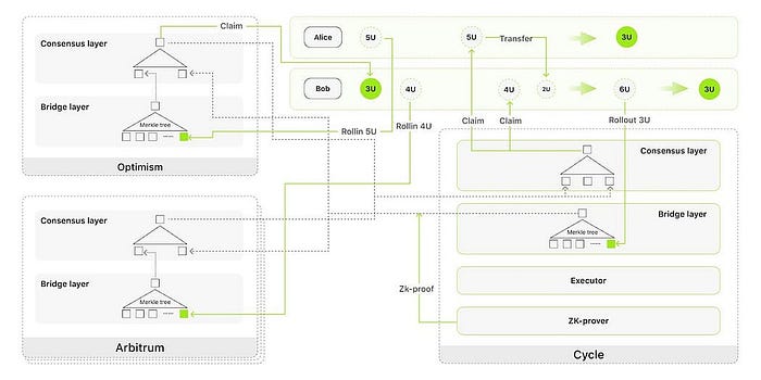 以下案例说明了如何使用Rollin和Rollout接口。来自Arbitrum的Alice通过Cycle转账2U给来自Optimism的Bob,他们的全链账户状态变化如右上角所示: