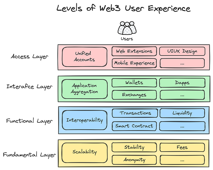 链抽象并非特定技术,而是一种设计理念,需要组合各种解决方案,覆盖用户与区块链交互的不同层面。访问层 (Access Layer) 是用户与区块链交互的前端界面,负责提供直观、易用的用户界面 (UI) 和用户体验 (UX),供用户用以与多个链进行互动。接口层 (Interface Layer)是用户真正与构建在链上的应用进行连接的层面,提供安全可靠的访问通道。功能层 (Functional Layer) 负责连接去中心应用 (Dapp)和区块链,也是实现Web3在协议、用户、资产、流动性的互操作性 (Interoperability) 的关键。
