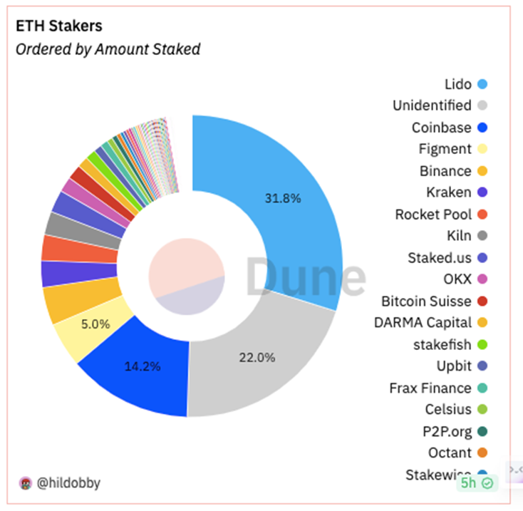 自2020年推出以来,Lido已成为以太坊2.0及其他第一层PoS区块链(如Solana和Polkadot)的首选流动性质押平台。与传统方式质押以太坊的32ETH最低门槛相比,Lido允许用户以任意金额进行质押,降低了财务障碍。然而,随着Lido的快速增长,人们开始对其对以太坊去中心化的潜在威胁感到担忧。截止目前,Lido已经质押了8,813,670ETH,占据了以太坊质押市场31.8%的份额。