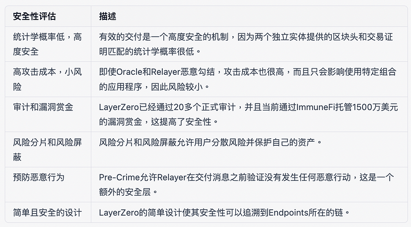 LayerZero的安全模型基于两个独立的参与者,预言机和中继器,通过共同行动来确保协议的安全。每当消息从一个链发送到另一个链时,预言机等待在发送链上的交易完成,然后在接收链上写入相关信息,然后中继器向接收链发送一个证明,证明存储的区块头包含消息。LayerZero的安全基础如下: