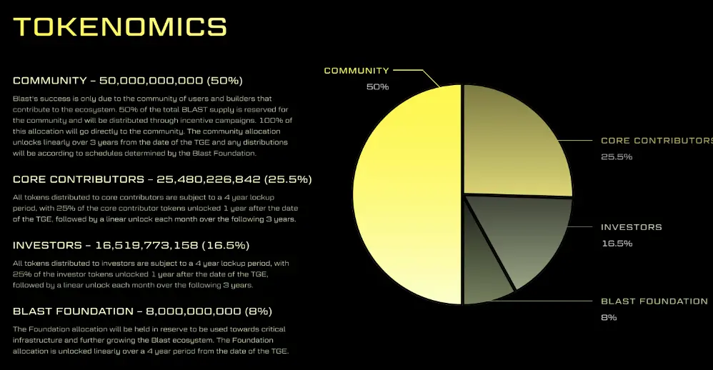 Blast的代币经济学主要分配为四大类: