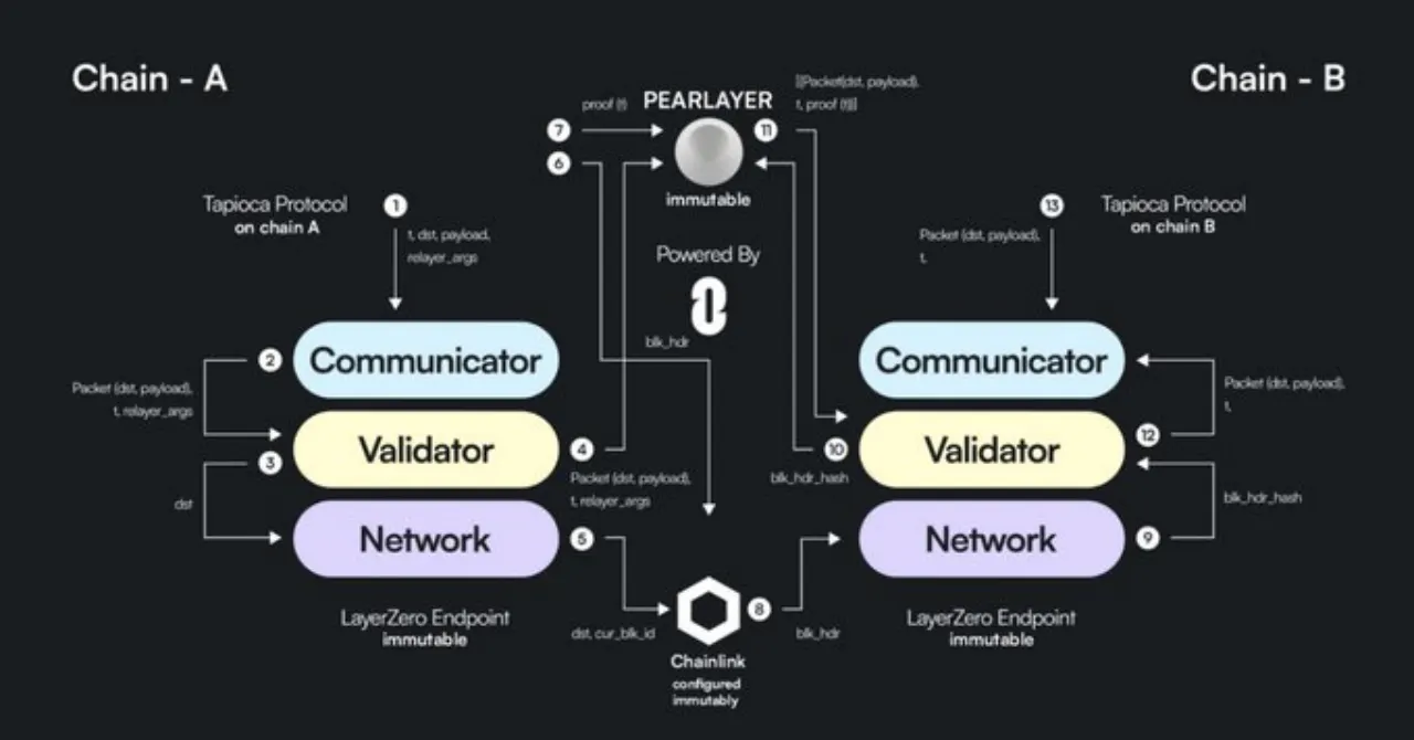 PearLayer是Tapioca的中继器,利用LayerZero的Pre-Crime机制,支持Arbitrum、Optimism、Ethereum、Avalanche、Base、Berachain、ZKSync、Starknet、Mantle Network、Cosmos、Sei、Polkadot等链。