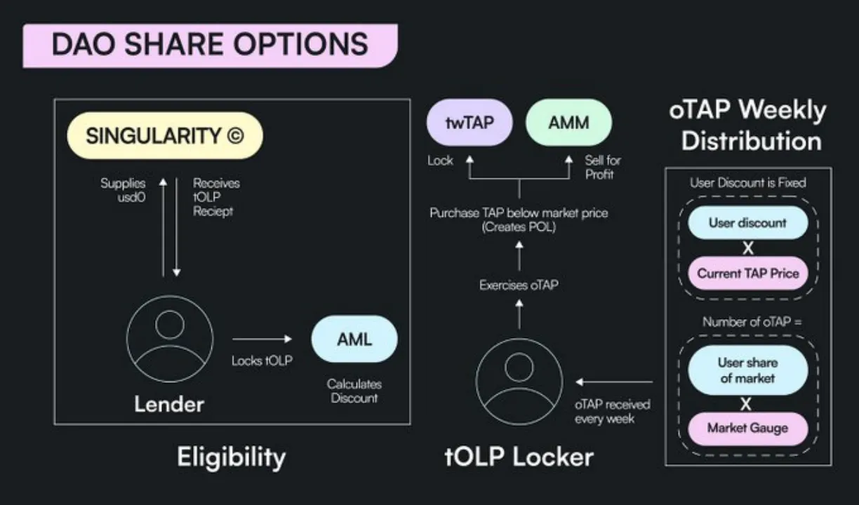 通过向信贷市场提供流动性的用户将获得代币收据(tOLP),可以选择将其锁定一段时间。在此期限结束时,他们将获得一个具有指定行权价的oTAP,让他们选择(而非义务)以优惠价格购买TAP代币。