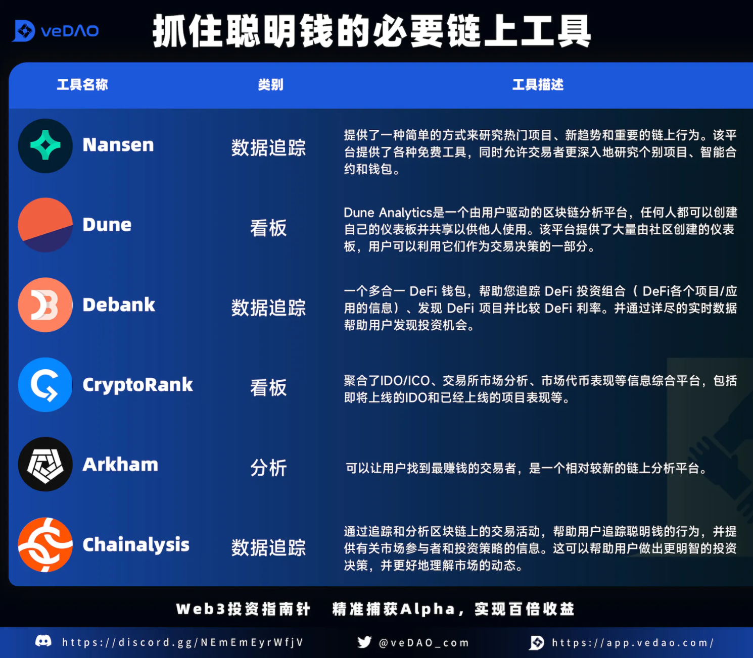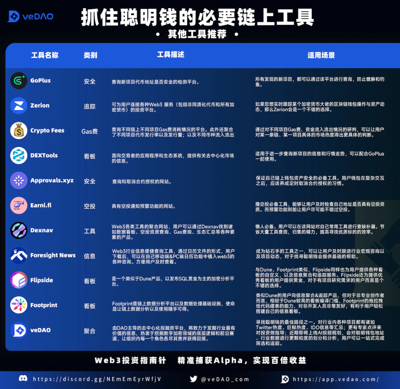 除上述 5 个工具外,veDAO 研究院还为大家汇总了其他几个常用的工具,帮助大家更轻松的找到聪明钱。