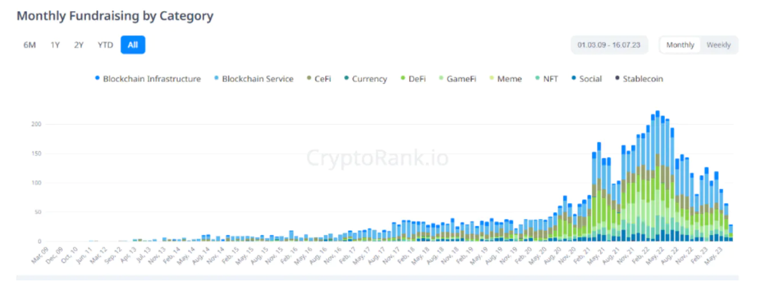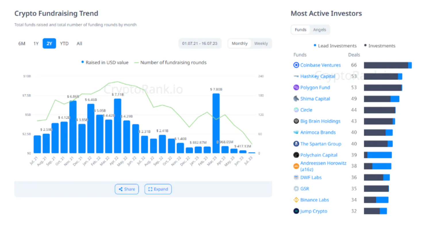 对于聪明钱在加密领域的更一般视角,CryptoRank 还提供了各种图表,突出显示重要的数据,如月度资金变动、最受欢迎的投资类别和最活跃的基金等。