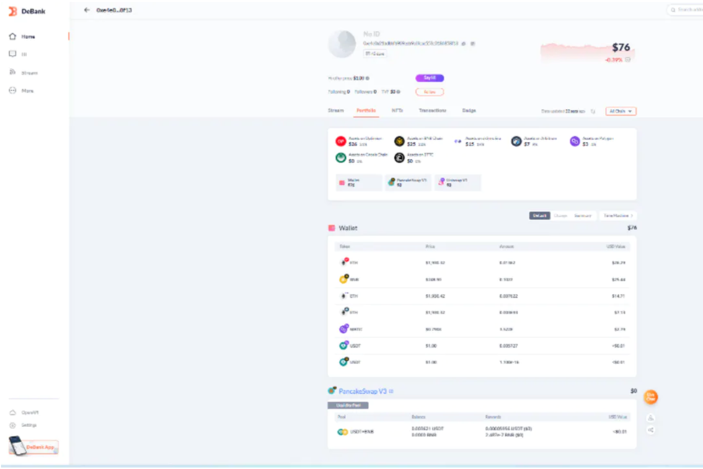 接着,用户可以将他们的钱包地址复制并粘贴到 DeBank 中,在那里您可以了解到他们当前的代币持有情况以及他们最近的交易。通过这些信息,用户可以获得他们的交易和投资策略的一些线索。