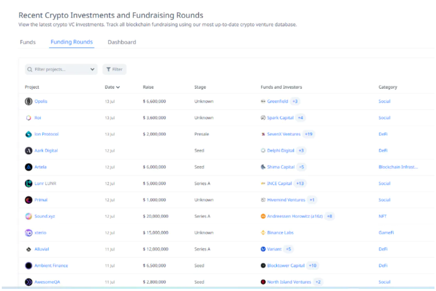 CryptoRank 可以用来检测近期的资金新趋势, 尽管该平台不像上述工具那样提供即时的链上分析,但 CryptoRank 提供了大量的数据,可以用来挖掘新的市场趋势和机会。该平台提供了各种工具和跟踪器,帮助用户深入了解市场,了解当前的资金投资情况。