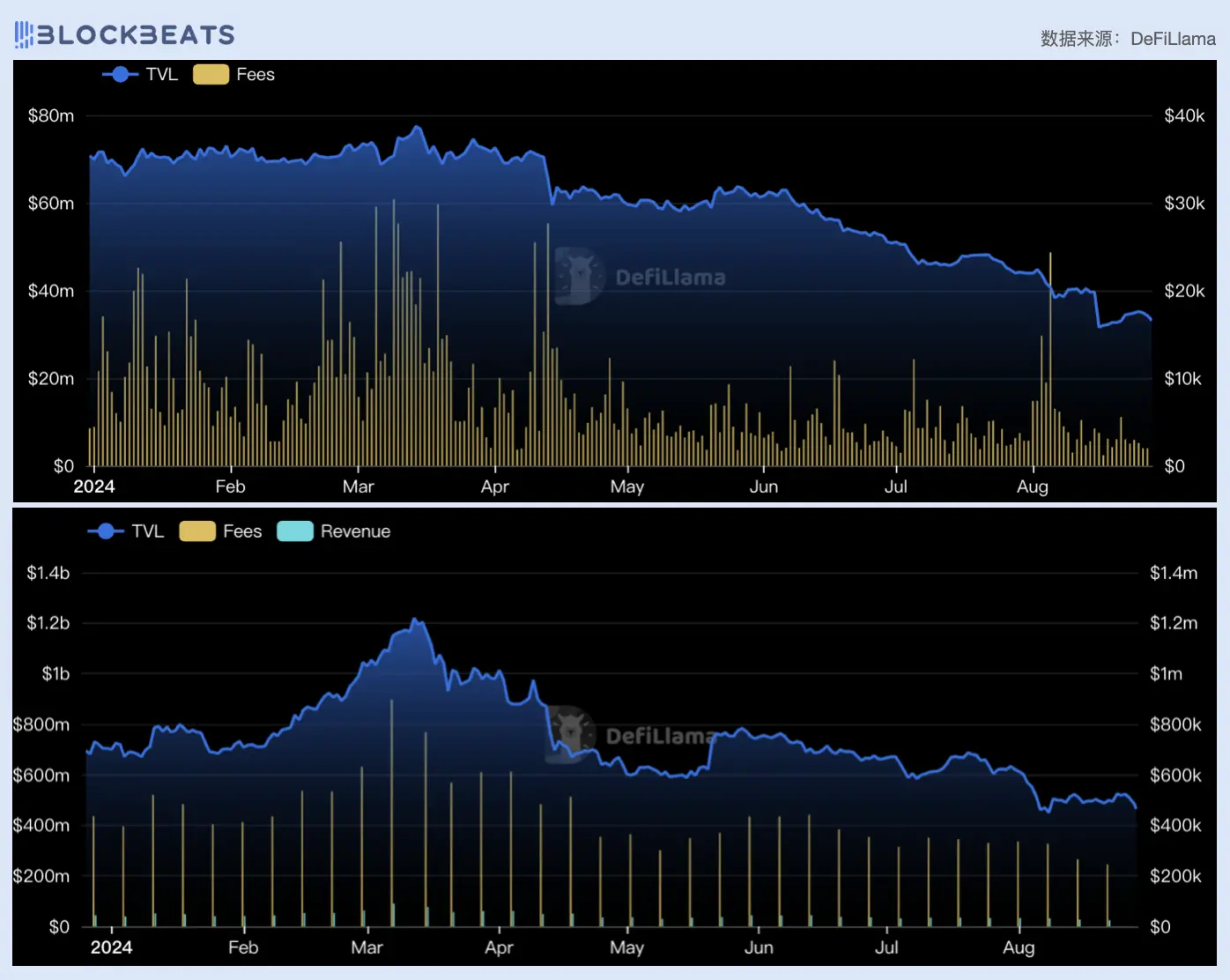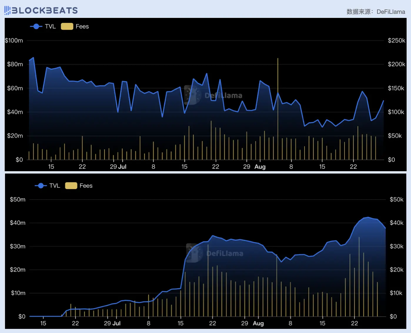 上:Trader Joe V2.2 TVL 及费用数据变化;下:Trader Joe V2.1 TVL 及费用数据变化