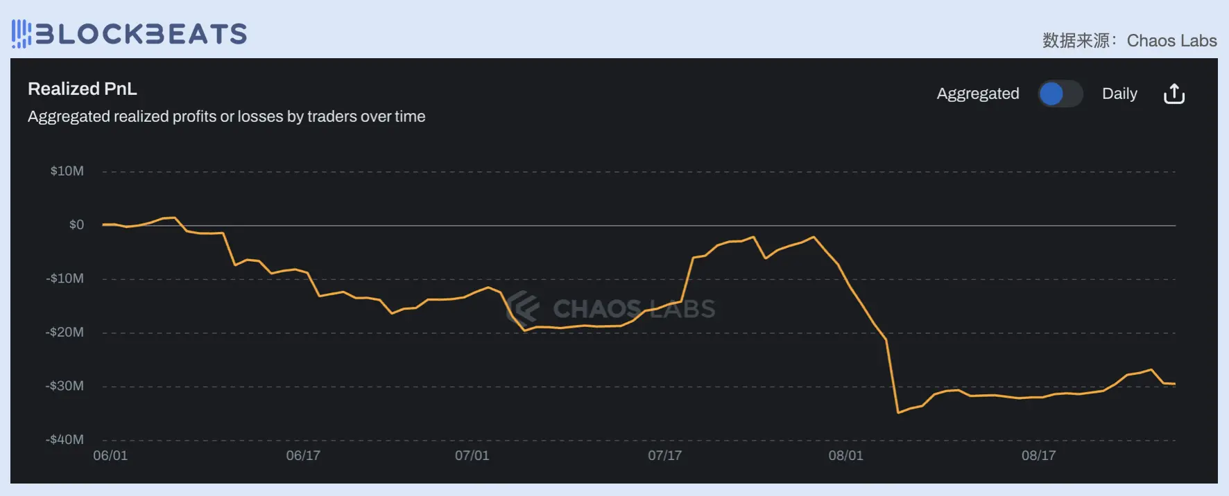 Jupiter 永续合约产品的交易手续费中,日交易量主要在 2 亿美元到 9 亿美元之间,8 月 5 日时峰值 16 亿美元的峰值。与之相对应的是合约用户的持续亏损,据 Chaos Labs 数据显示, Jupiter 永续合约产品上的交易者近三个月以来都处于亏损状态,在 8 月 5 日市场遭遇大幅波动时,交易者的亏损金额超过 3000 万美元,这些亏损为 Jupiter 带去了清算收入。可以说在理想情况下,大盘上涨时, JLP 作为「加密市场蓝筹 ETF 」可以与市场同频上涨,而当市场结束单边上涨行情时,在 Jupiter perps 上的交易者亏损变多, JLP 收益也会增加,实现正向飞轮。