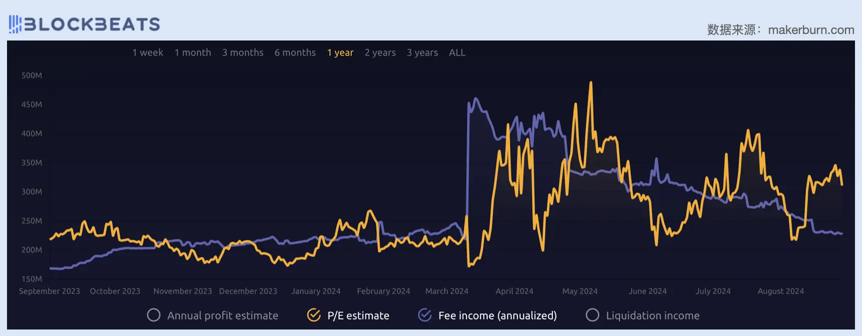 而据 makerburn . com 数据, Maker DAO 官方给出的 PE 值为 31,处于近一年以来的高位水平,但是从协议收入上看, Maker 的收入自年初激增后便迅速回归原有的下降通道。这意味着从 MKR 代币价格层面讲,市场并未因 Maker 协议收入的下降而降低对其估值的预期。