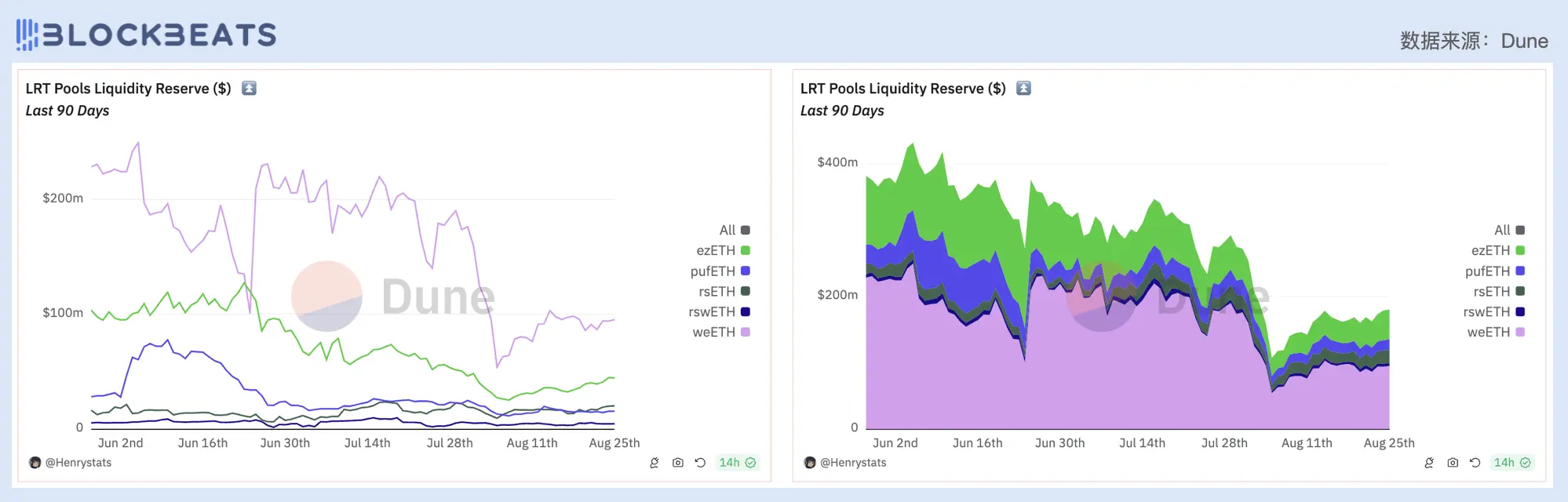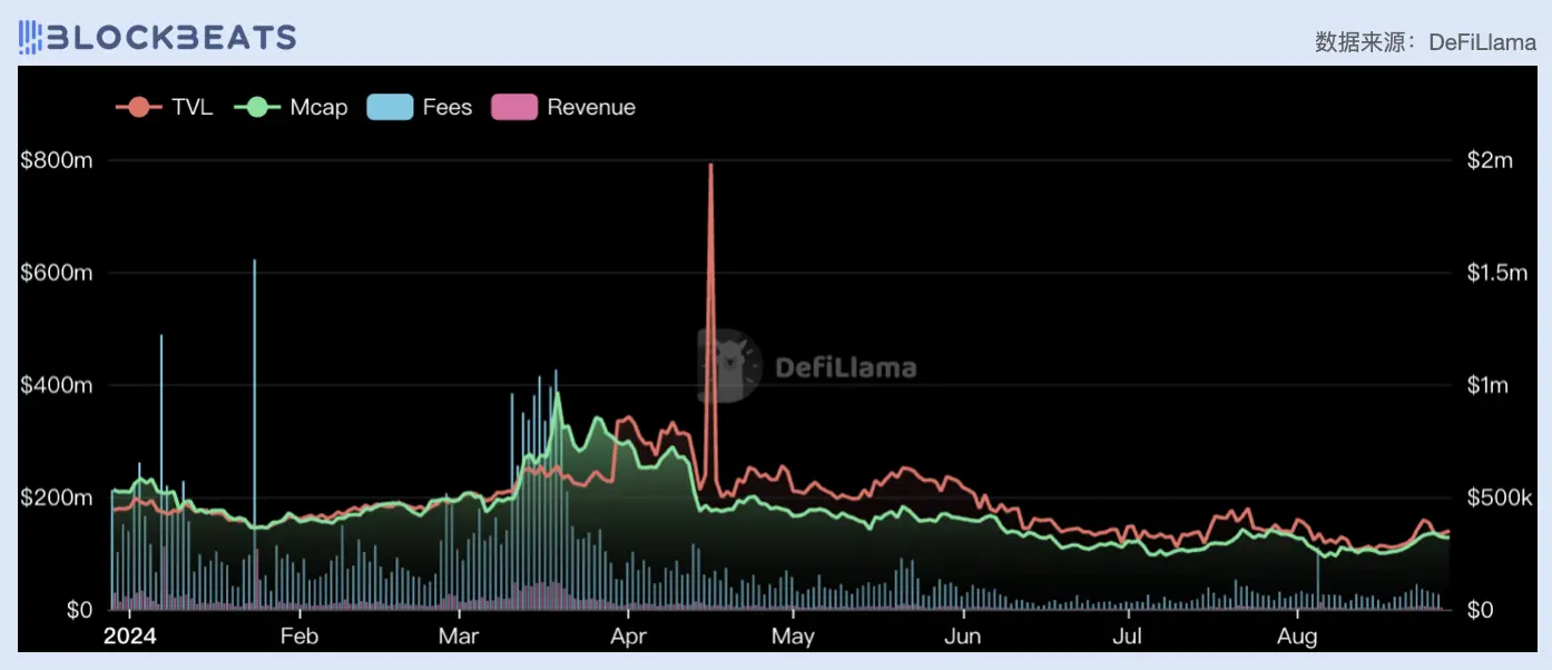 4 月的以太坊质押热潮为 Pendle 带去了巨量的流动性资金,这种繁荣一直持续到六月初。 Pendle 上大部分交易都集中在与以太坊及其相关再质押代币上,在这段时间的繁荣体面依赖如 Etherfi 、 Ethena 和 Renzo 等 LRT 协议的空投激励,这些协议都为 Pendle 上的流动性提供者赋予了 2-4.5 倍的空投积分乘数,也为 Pendle 之后的业务发展埋下了风险。