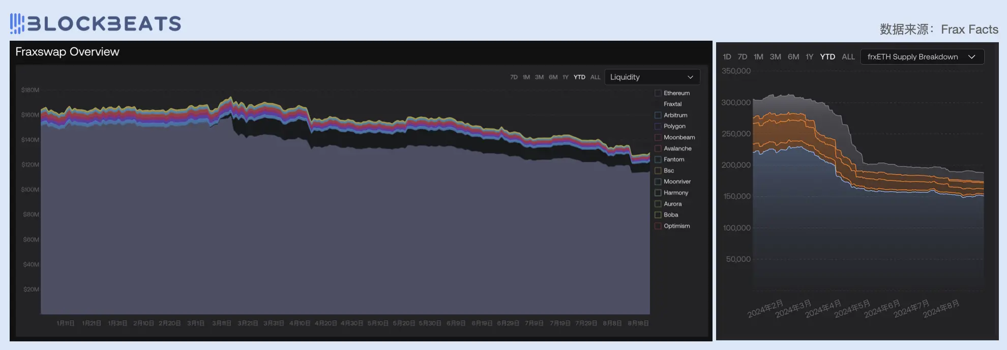 左:Fraxswap 各链交易量占比变化;右:frxETH 供应量变化