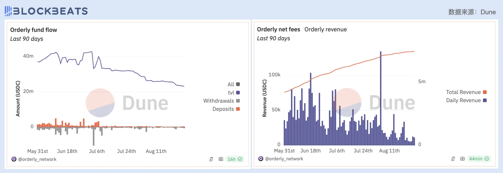 左:Orderly 协议资金流动及 TVL 变化;右:Orderly 协议利润