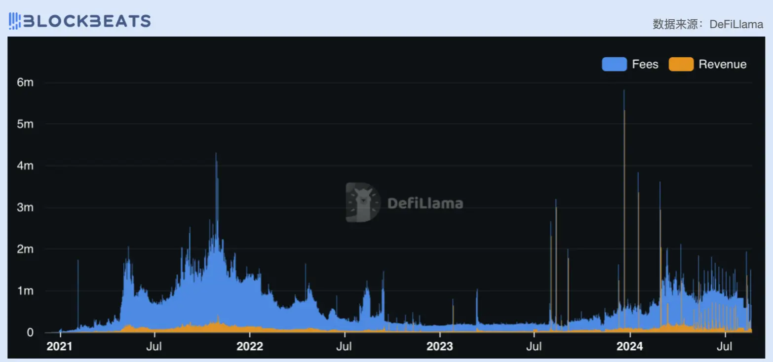 尽管 Uniswap 协议上的交易活动只有极小部分通过官方 Web 端 API 完成,但由于协议 GMV 十分可观,所以团队仍能据此创造不小的盈利。截至撰稿时,其总收入已达 5960 万美元,即将突破 6000 万美元大关。
