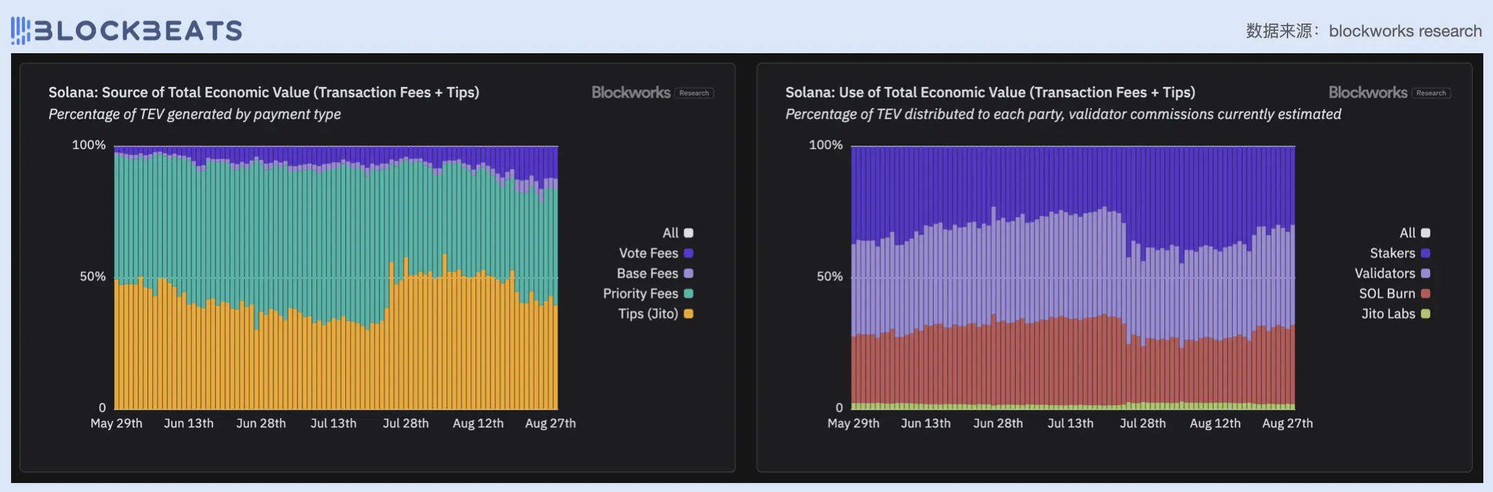 左:Solana 链上交易量(流量)来源;右:Solana 链上价值(收益)分配流向