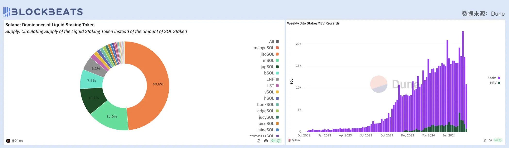 左:Solana 流动性质押市场占比细分;右:Jito 流动性质押资金规模及 MEV 费用收入