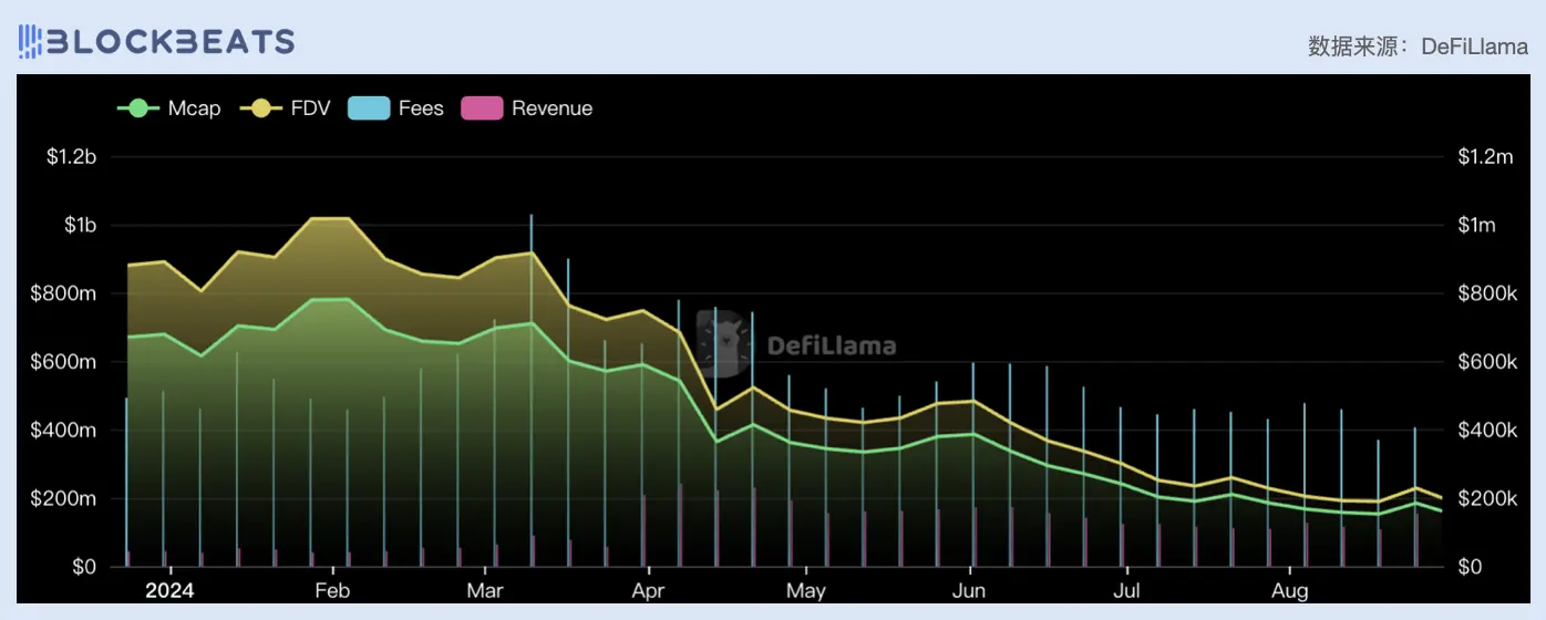 Pendle Finance 是链上利率衍生品市场的先行者。2023 年,这个市场经历了显著的增长, Pendle 在 2023 年 Q4 的流通 PE 指数达 555,在 2024 年前半年经历了大幅回落跌至 77.9,在近期回升到 180 附近。