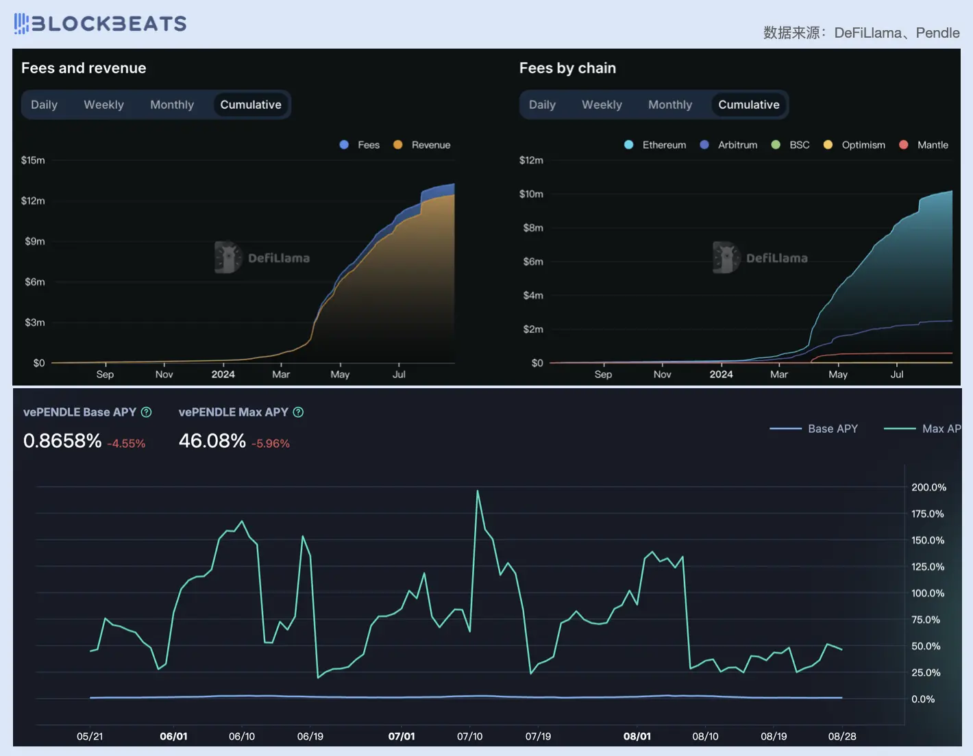 左上:Pendle 协议累计费用收入及利润;右上:Pendle 各链累计费用收入来源细分;下:过去 90 天 vePendle 基础 APY 及最大 APY 变化