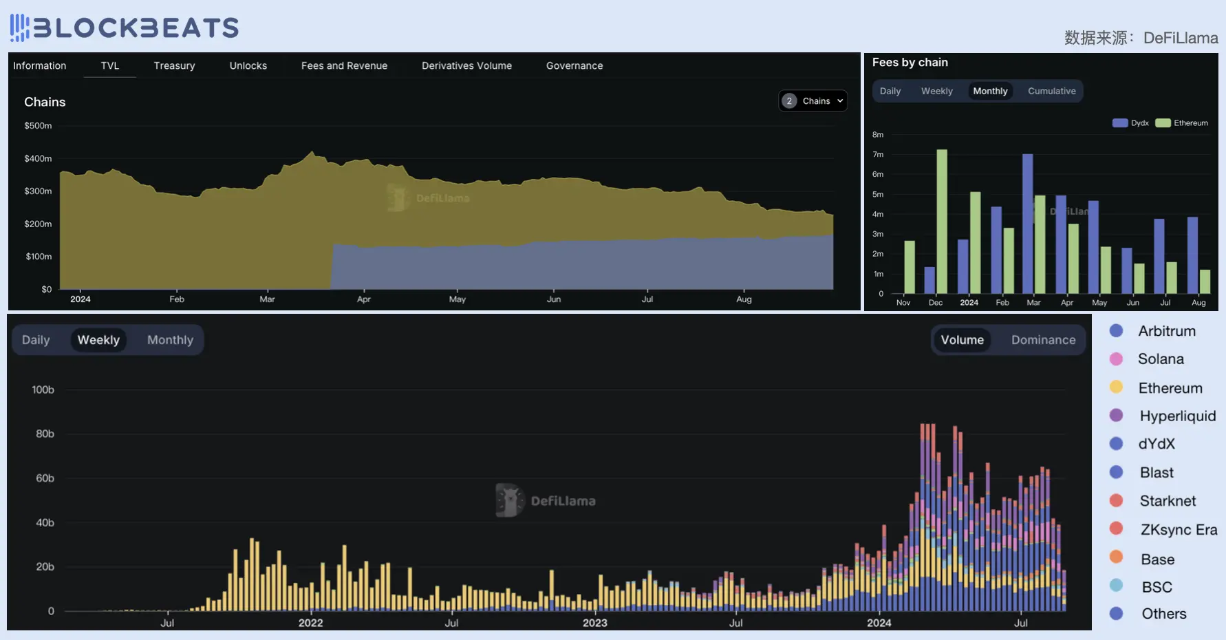 左上:dYdX 协议 TVL 细分;右上:dYdX 协议费用收入来源细分;下:永续合约市场占比变化