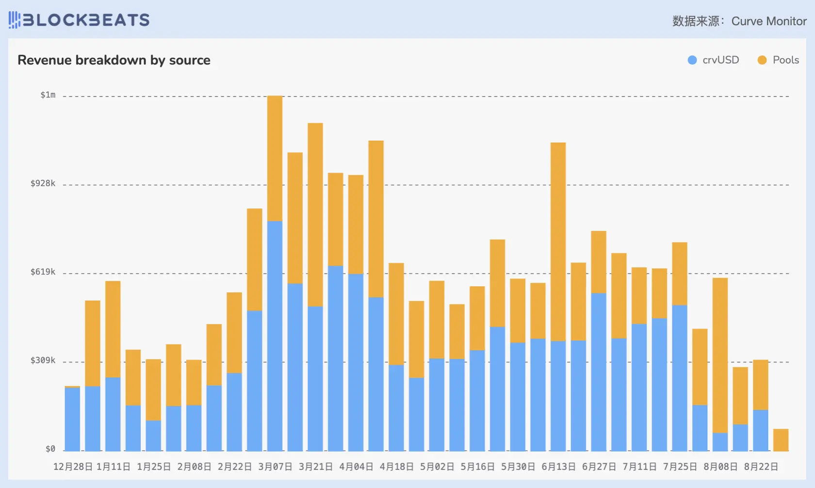 今年 6 月, Curve 改变其费用分配激励机制,从 3CRV 代币过渡到其原生稳定币 crvUSD ,以提高 crvUSD 的实用性,增强 Curve 的稳定性和流动性, crvUSD 之于 Curve 的救赎作用曾一度十分明显。从收入渠道看, crvUSD 推出以来一段时间内曾超过 Pool 的收入。但 8 月 5 日,加密行业发生大规模链上清算,致使 Curve 下调 crvUSD 的借贷利率, ETH 、 WBTC 等池子的利率低至零点几,资金出逃明显。