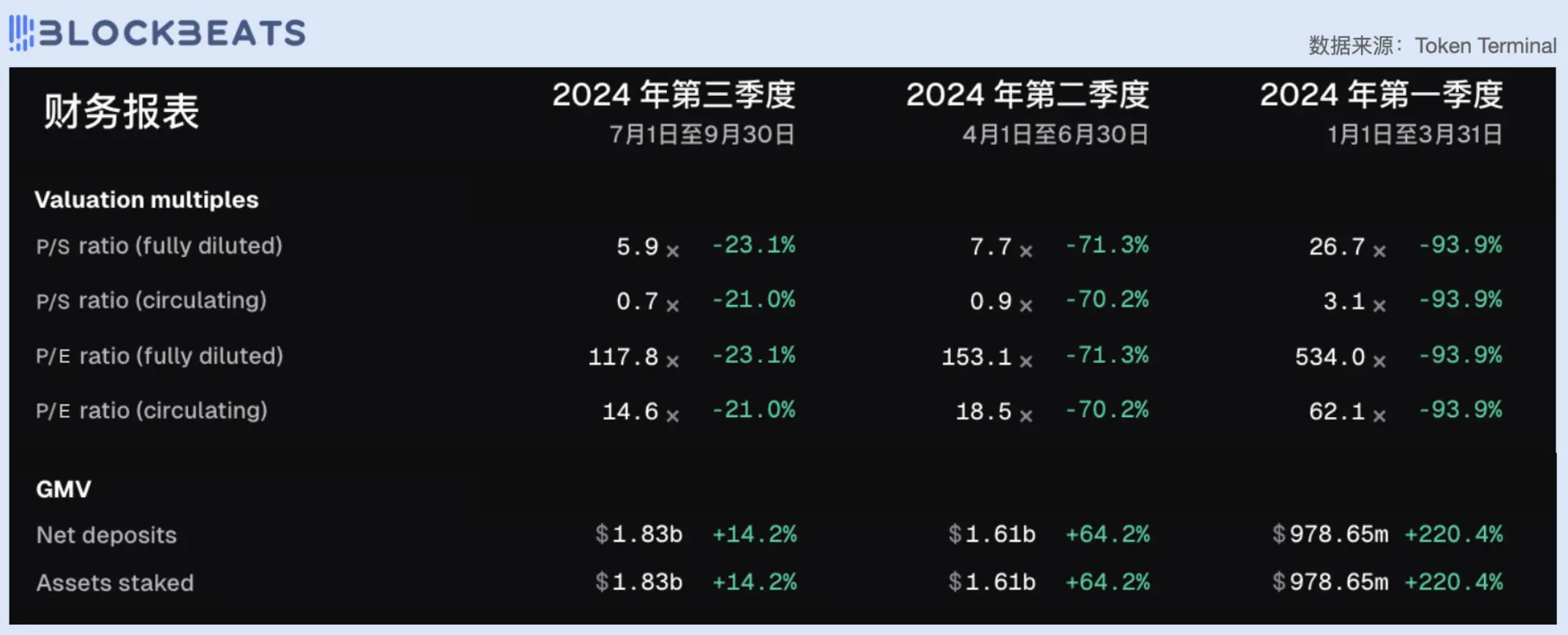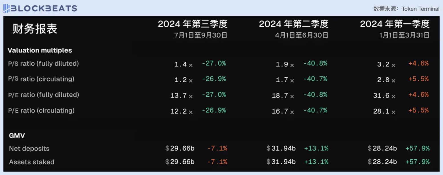 但随着项目伊始阶段的红利期结束以及竞争对手的增多,市场对 Jito 的估值预期在逐渐回到正常水平。从第一季度 Solana 生态火热起势, Jito 刚刚完成空投并且上线各大交易平台, PE 值高达 534。但第二季度市场情绪趋于冷静后, Jito 的 PE 值回落至 153,目前稳定在 120 上下。但 Jito 的 GMV 也在稳定增加,目前第三季度还未结束就已经超过第二季度总额。