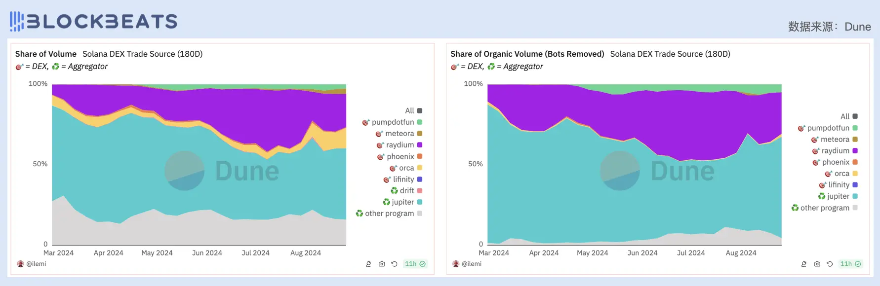 左:Solana DEX 交易量来源细分;右:Solana DEX 交易量来源细分(去除机器人交易)