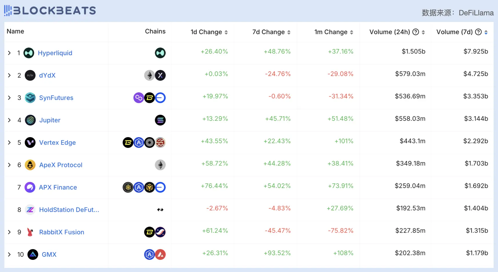 过去 7 天 Perp DEX 交易量排名