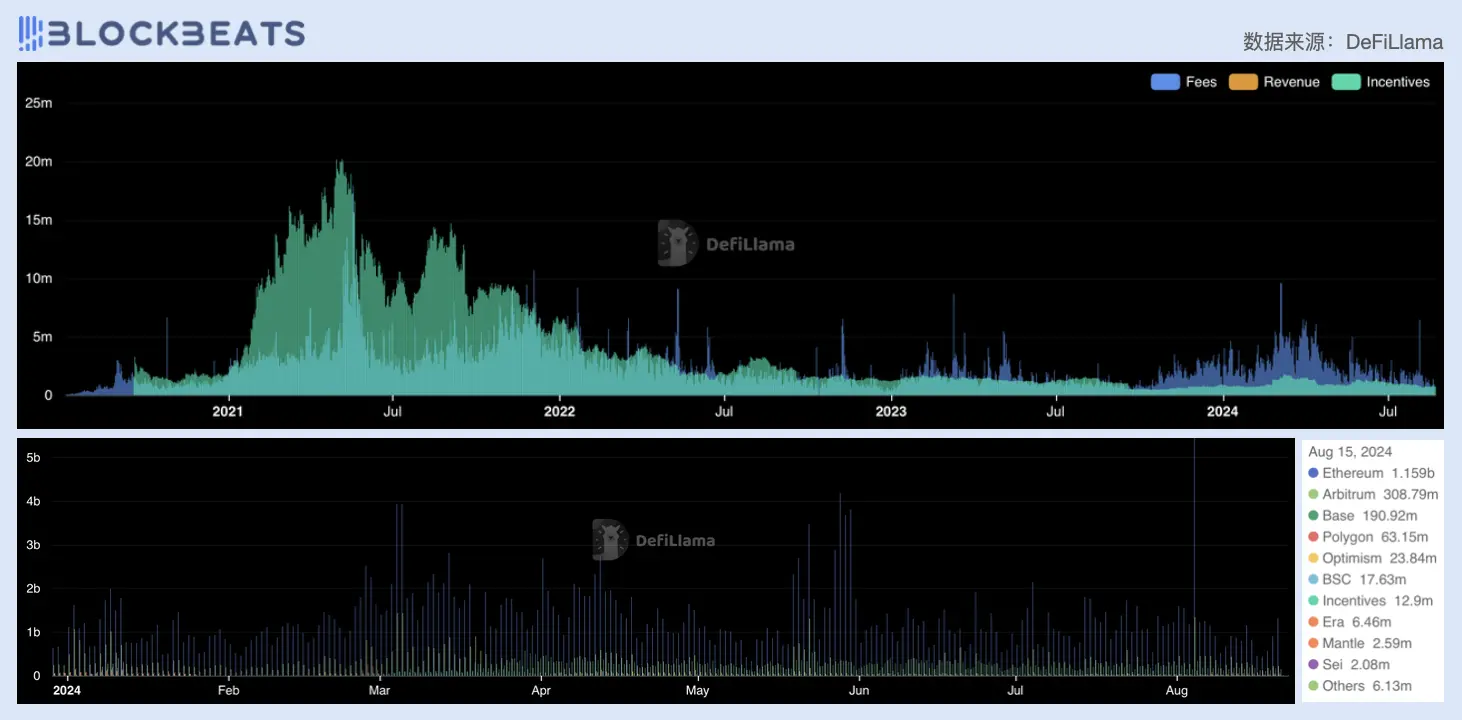 从费用收入的来源看,尽管 Uniswap 团队和社区在过去半年努力推进协议的多链发展,但以太坊主网仍然是协议目前最大的费用来源,交易量仅 8 月 15 日一天就达 11.6 亿美元,其次是 Arbitrum 与 Base ,二者交易量总和大致与主网相同。据 CoinGecko 最新报告显示,今年上半年, Uniswap 仍然是 ETH 消耗量最大的应用协议,共计销毁约 71,915 枚 ETH 。