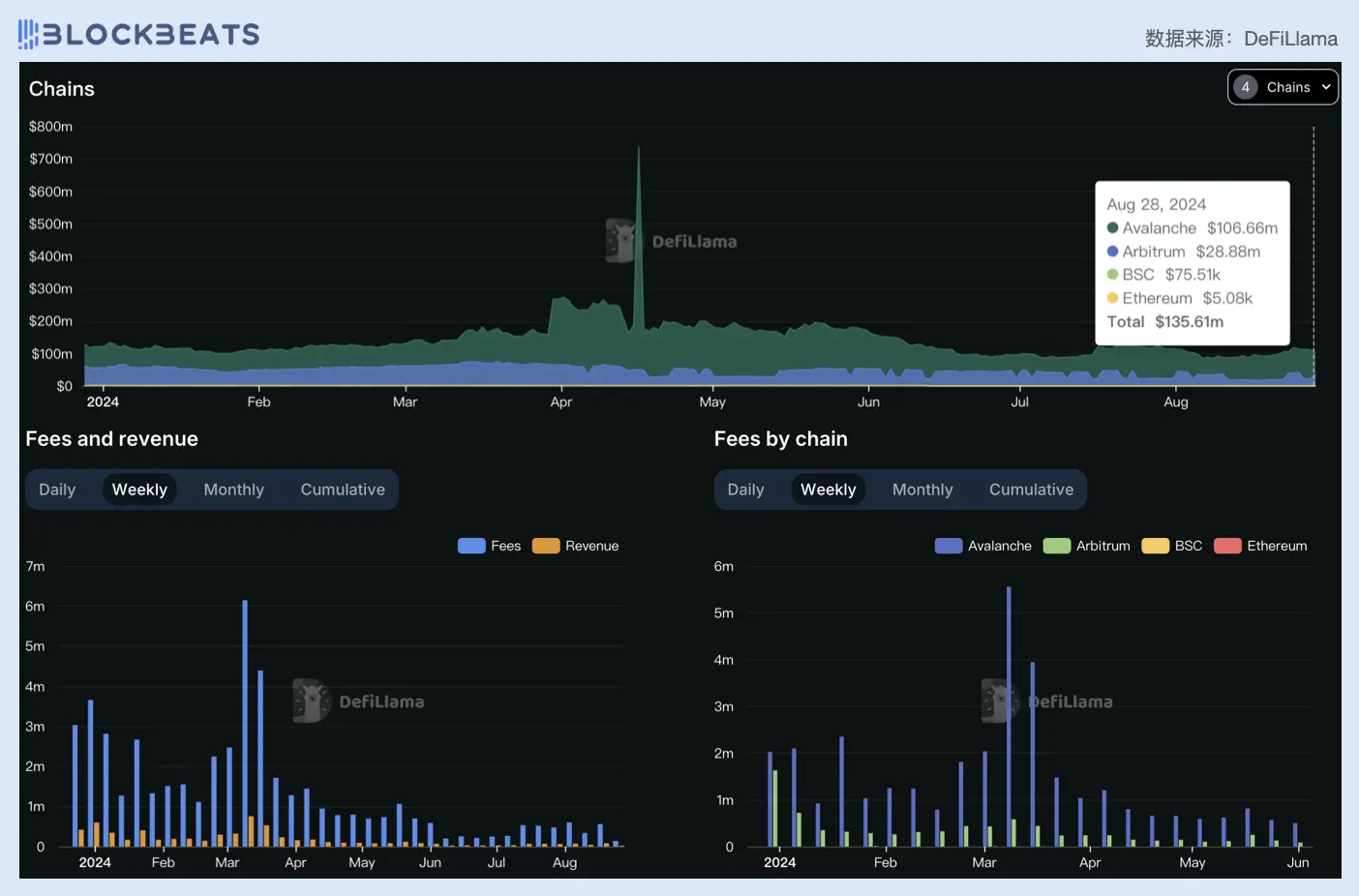 2024 年初以来, Trader Joe 的 TVL 维持在 1.5 亿到 2 亿美元之间,在 4 月至 6 月期间有较繁荣的表现,近一个月 TVL 已经降至 1 亿美元以下。 Trader Joe 的 TVL 主要分布在 Avalanche ($114. 26M ) 和 Arbitrum ($45. 38M ),分别占总 TVL 的较大比例,相应的, Avalanche 也是 Trader Joe 的主要的手续费贡献来源,占比大约在 60% - 70% 之间,其次是 Arbitrum ,占比 21%。