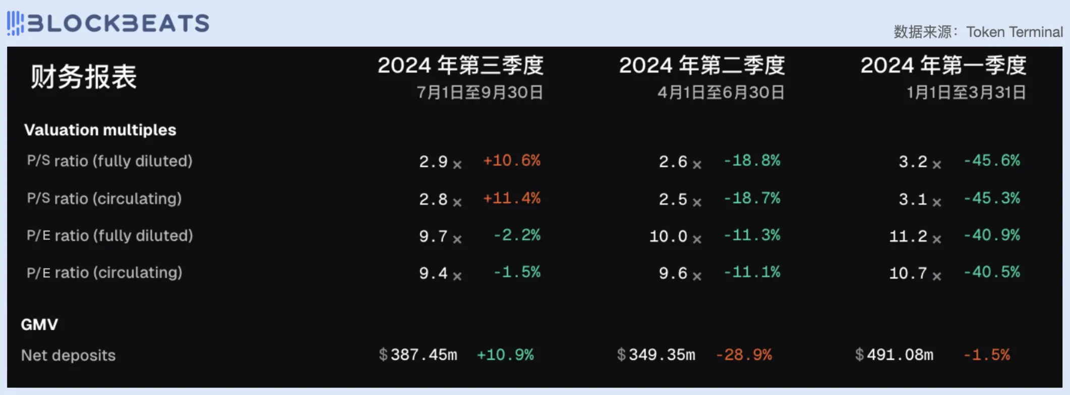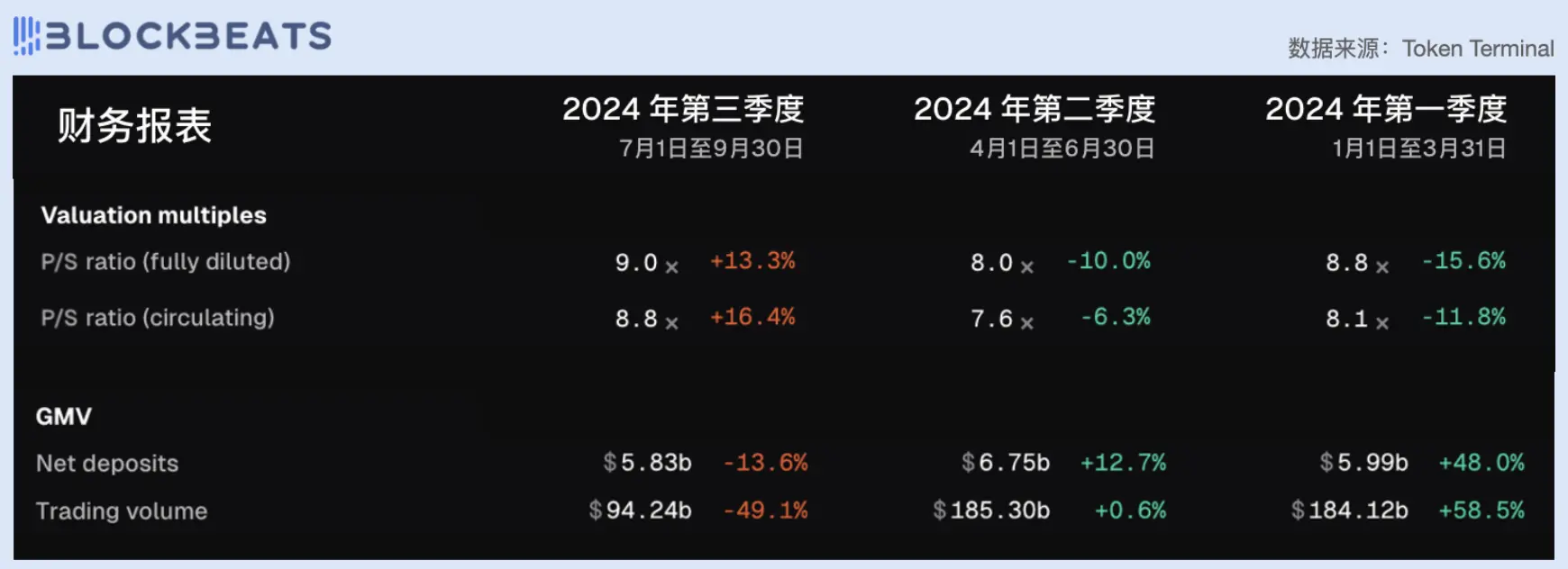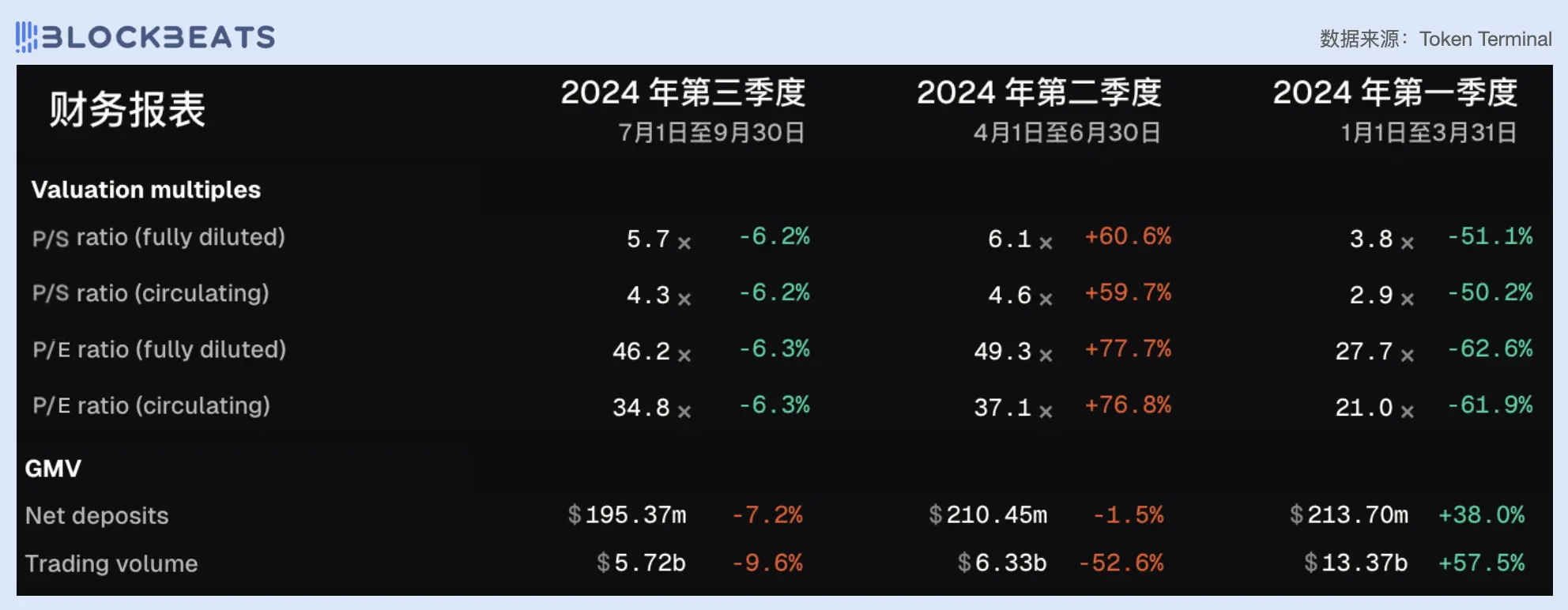 GMX 的 PE 值近三个季度一直小幅下降,维持在 10 左右。 GMV 由于第二季度行情较差而表现不佳,截止目前第三季度的 GMV 总额已经超越第二季度总金额。