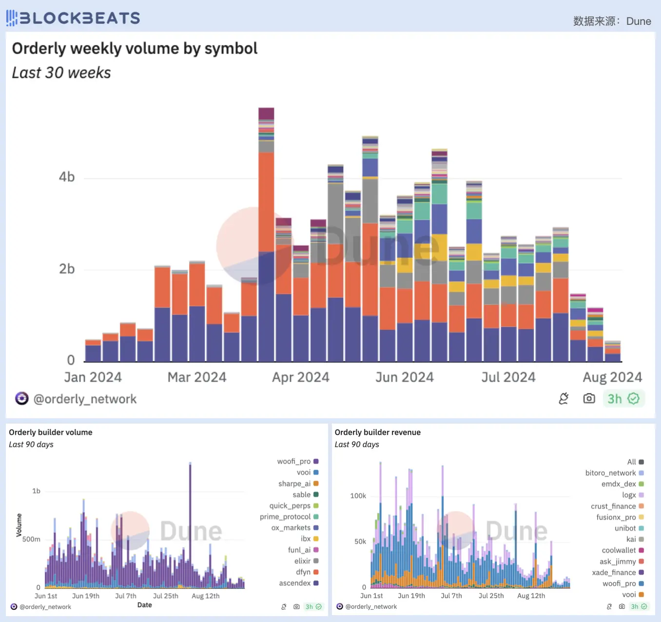 上:Orderly 永续合约交易对细分;左下:Orderly 交易量(流量)来源细分;右下:Orderly 价值分配(利润)流向