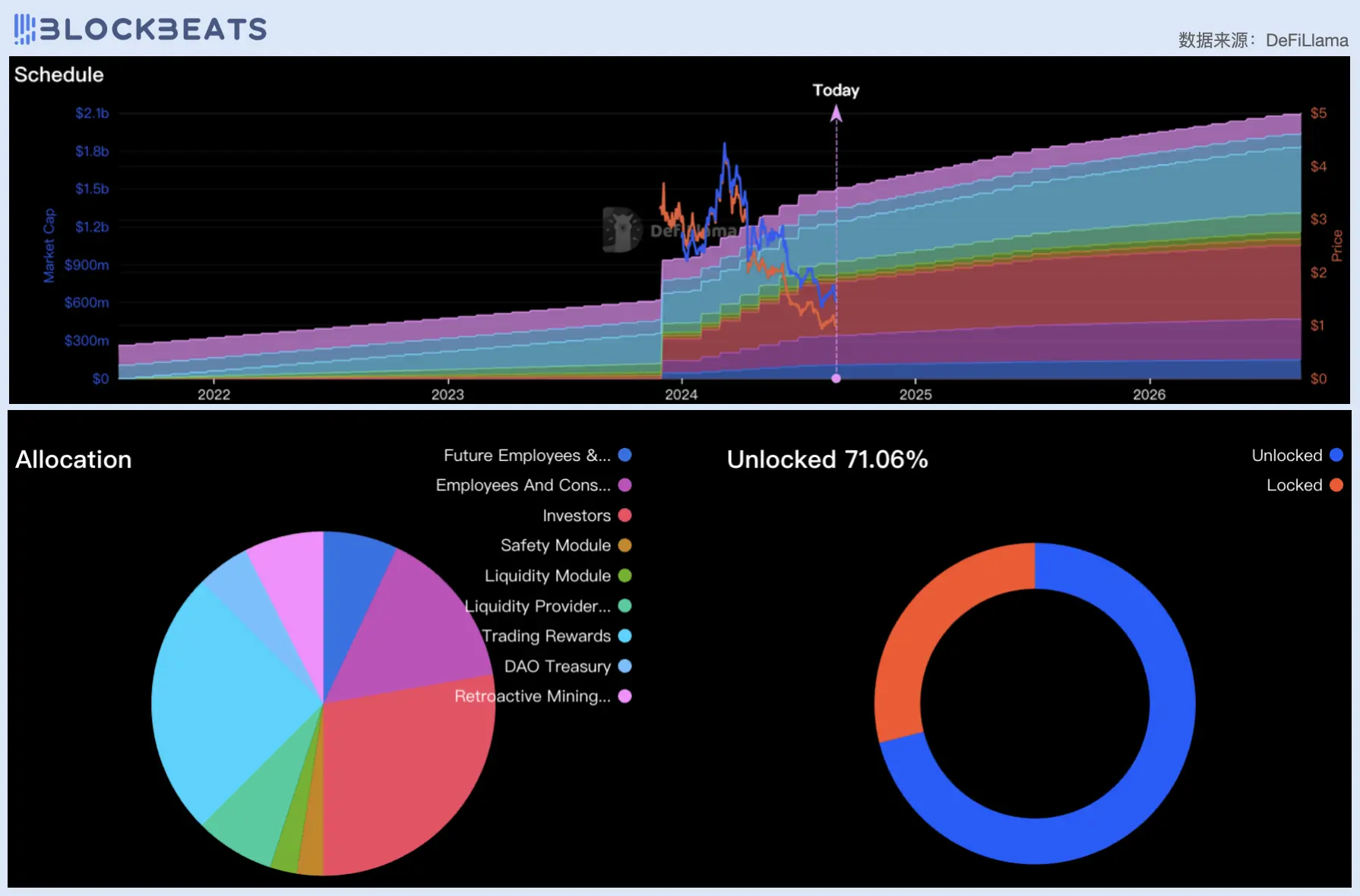 上:DYDX 代币解锁时间表;下:DYDX 未解锁代币比例及份额归属细分
