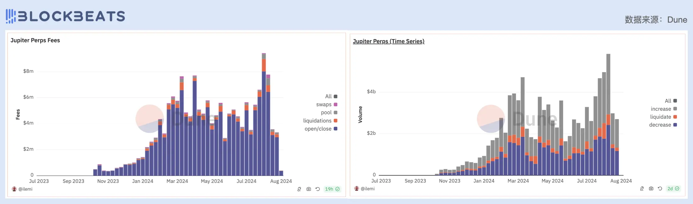 左:Jupiter 永续合约产品费用收入来源细分;右:Jupiter 永续合约产品用户交互行为细分