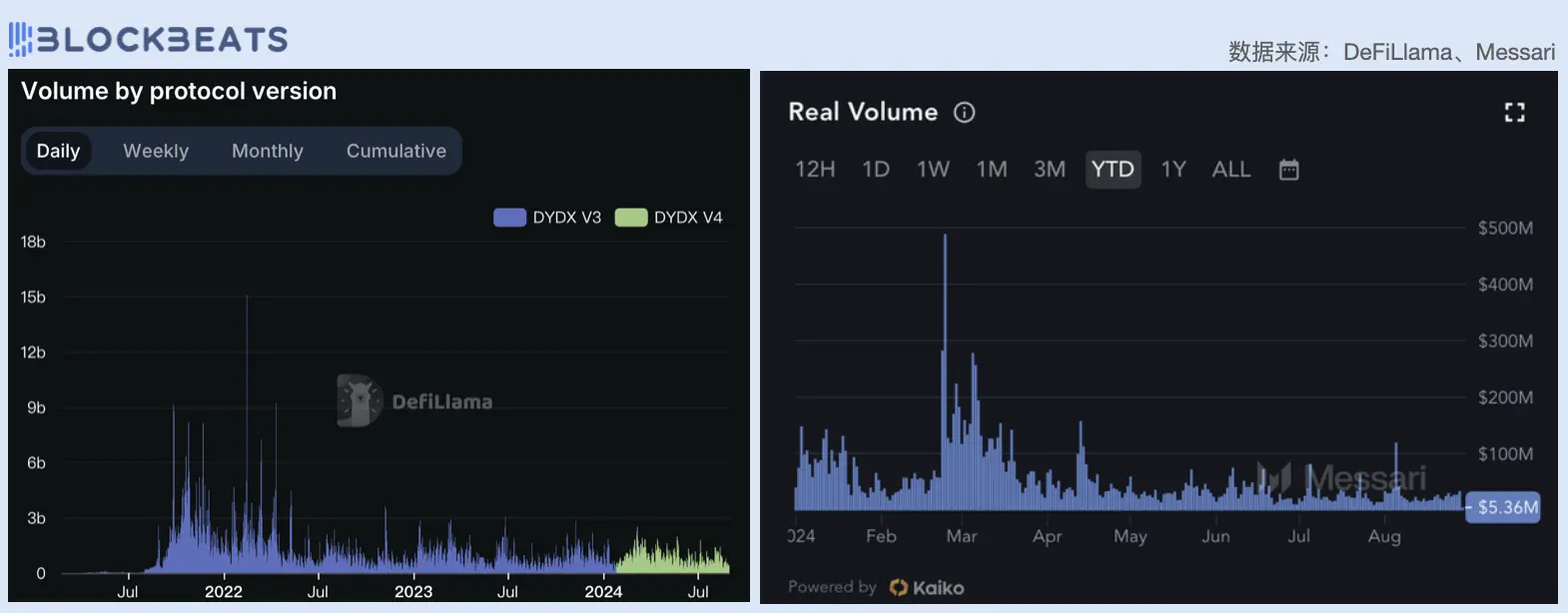 左:dYdX V3 及 V4 的交易量;右:dYdX 协议真实交易量