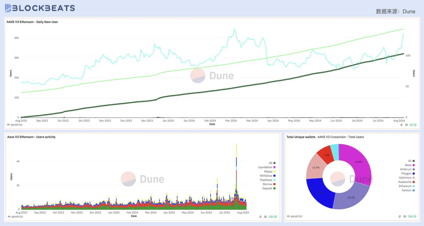 上:Aave 协议日新增用户;左下:Aave 用户活跃度及交互行为细分;右下:Aave 用户生态来源