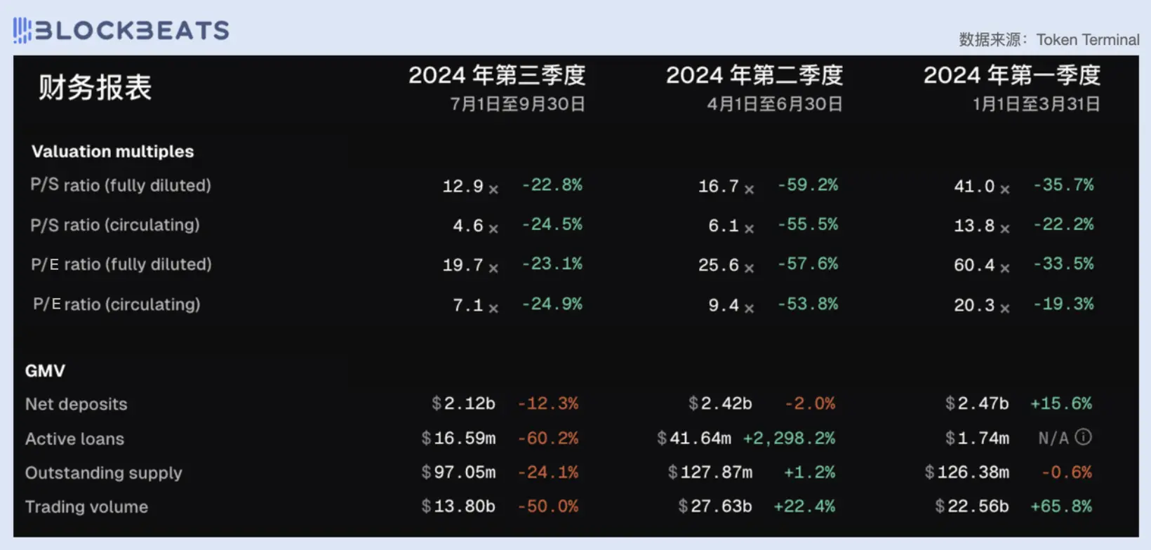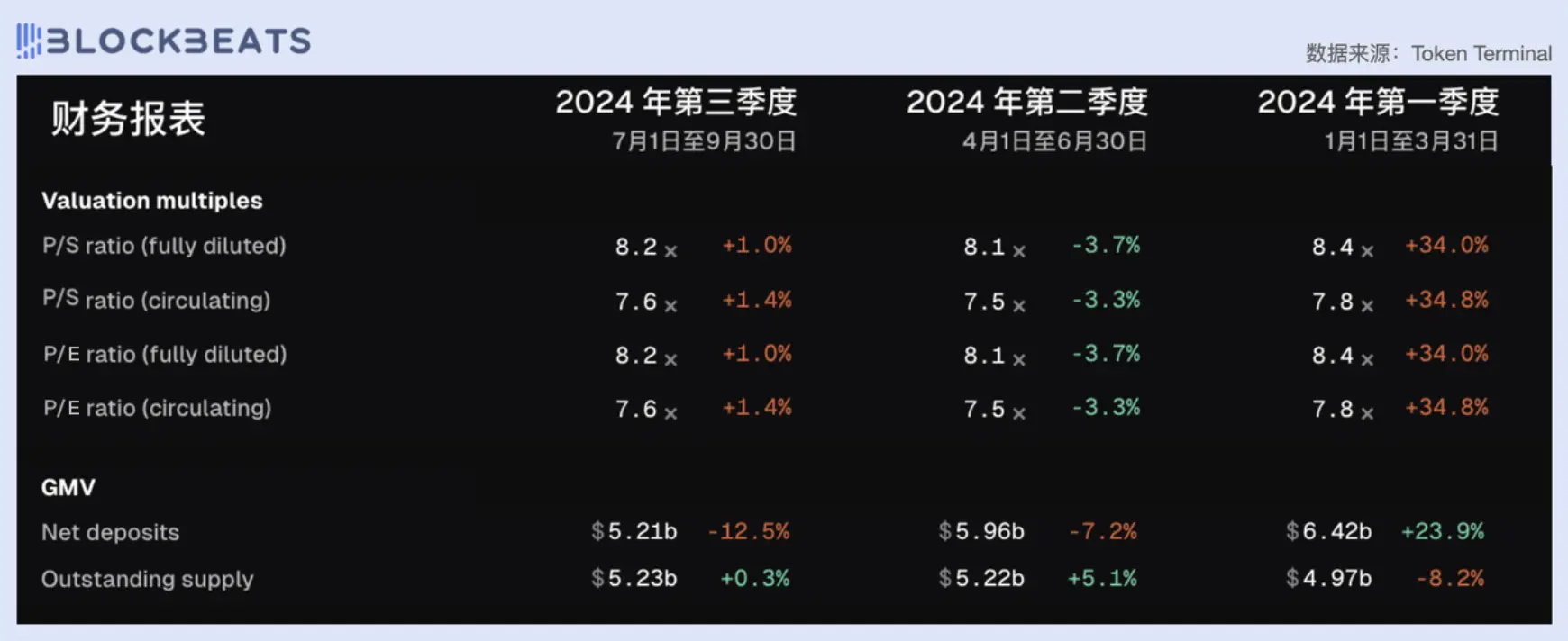 MakerDAO 的 PE 值今年一直较为稳定,三个季度都保持 8 左右。在项目发展历史上属于较低水平,仅次于 2023 年第四季度,彼时 MakerDAO 的市销率仅为 6.3。与此同时 MakerDAO GMV 也维持在一个稳定水平,与去年四个季度相比相差无几。