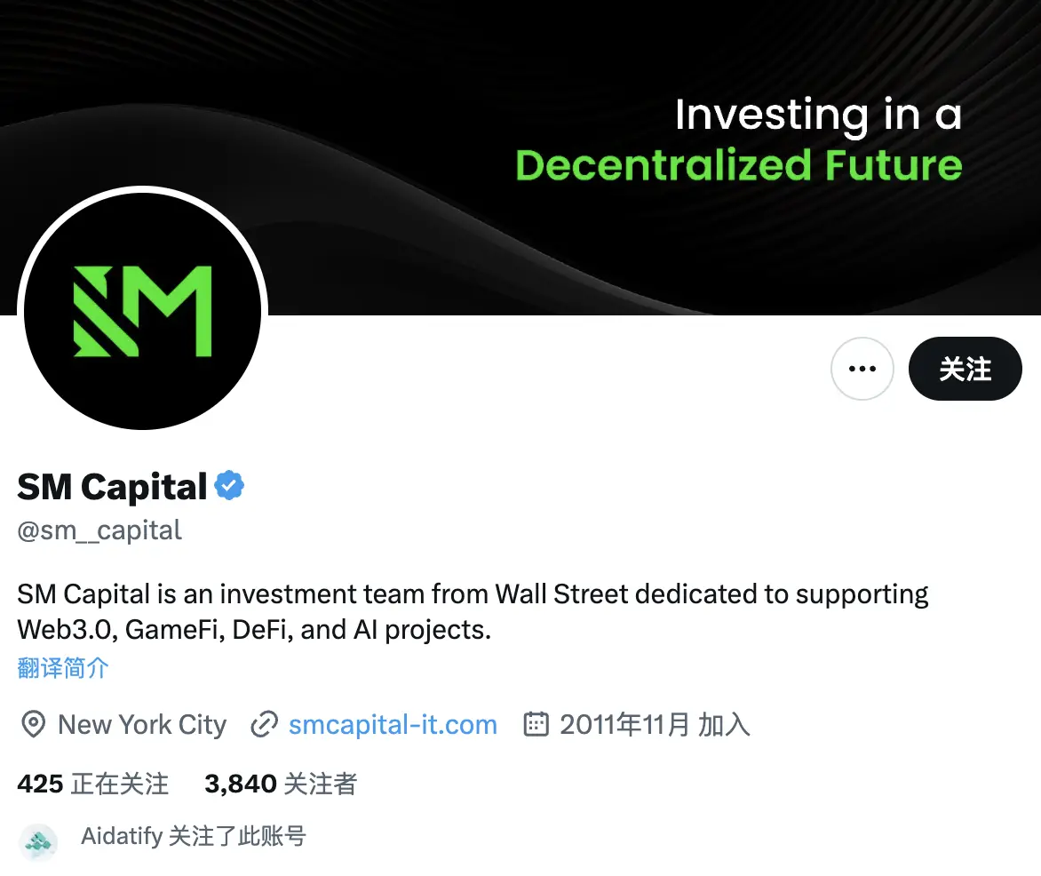 翻了一下 SM Capital 的官推,虽然显示 2011 年 11 月注册,但最早一条推特仅发布于上周。除了 Aidatify,没一个项目方关注。3840 名关注者中只有 8 名有蓝标认证,其他关注者都像是买的粉,刷着刷着就看不到了。