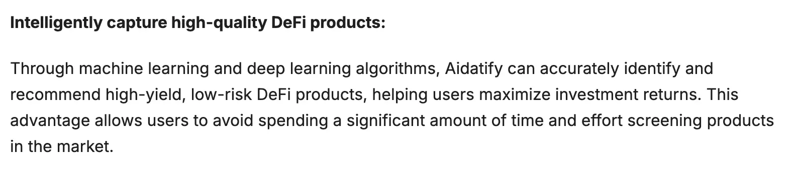 在白皮书中,Aidatify 还强调它能通过机器学习和深度学习算法,为用户推荐高收益、低风险的 DeFi 产品。但具体用什么算法做到这一点,却是只字未提。