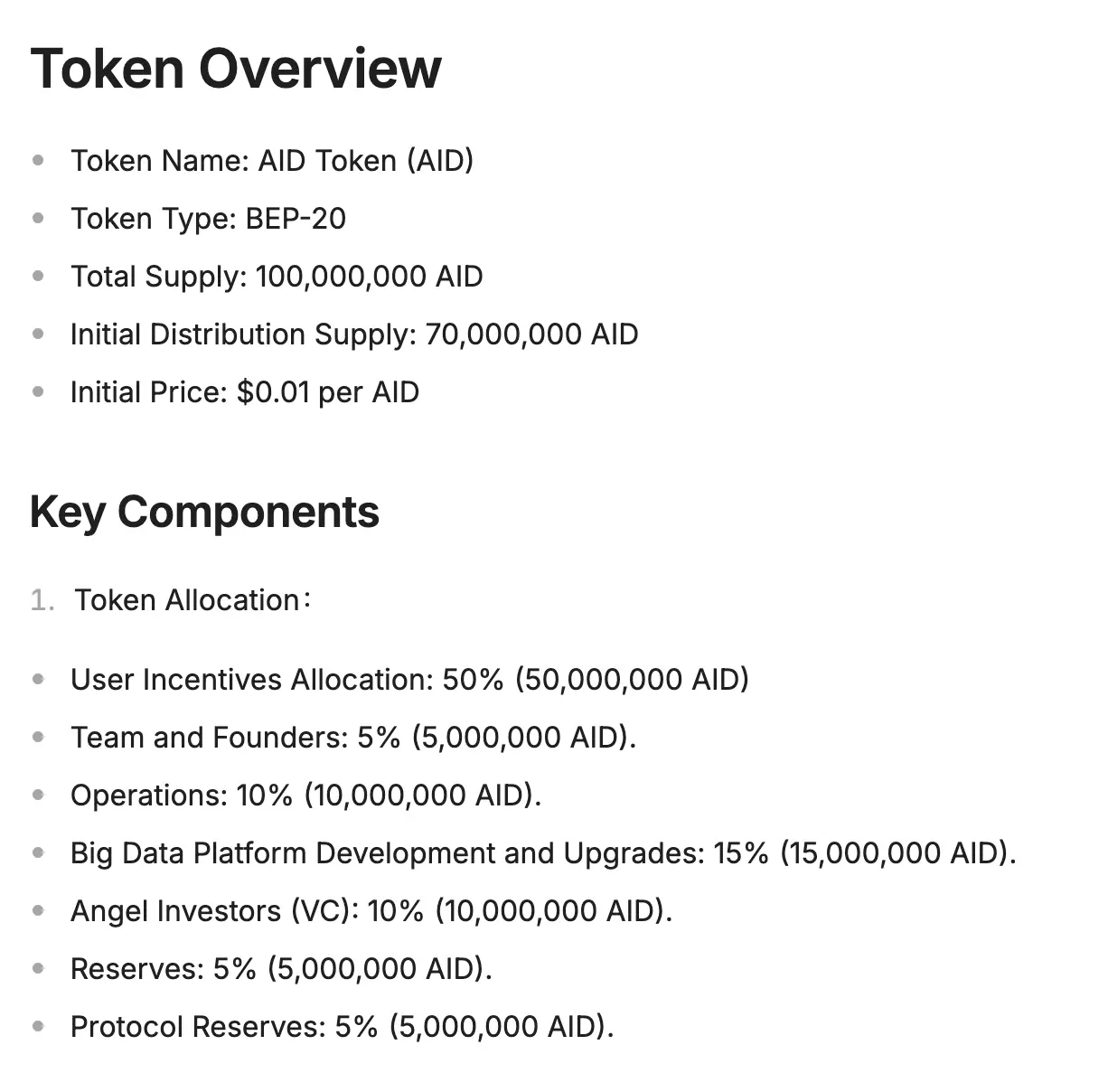 首先,Aidatify 公布的融资信息与其代币经济模型之间存在明显的不一致。Aidatify 宣布以 1.5 亿美元的估值完成了 1750 万美元的 A 轮融资。然而,根据其代币经济模型,AID 代币的完全稀释估值 (FDV) 仅为 100 万美元(1 亿代币 * $0.01 每枚)。投资者投入了 1750 万美元,但根据代币分配,分配给 VC 的代币价值仅为 10 万美元(1000 万 AID * $0.01 每枚)。