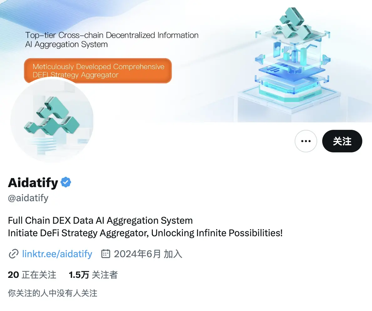 按照这个项目的官方介绍,它其实是一个 DEX 数据聚合器,产品功能上应该类似于 DefiLlama。之所以能和 AI 扯上关系,是因为 Aidatify 声称拥有先进的 AI 技术,可以每天处理 500 TB 的数据和 300 万个智能合约地址。