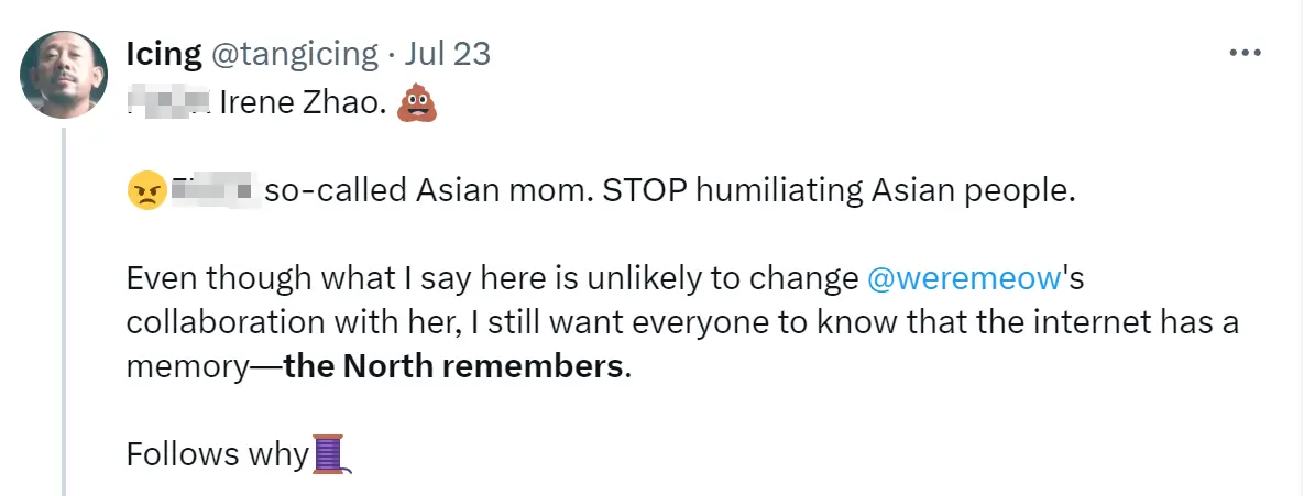 Irene Zhao :因为当时他很喜欢 Asian mom 这个叙事,觉得这个东西有很大的潜能。可能是因为社区本来已经帮我发了一个 Asian mom,当时热度也比较高。然后可能我在圈子里的时间也比较久,也有一定的粉丝基础,所以他觉得会比较适合。