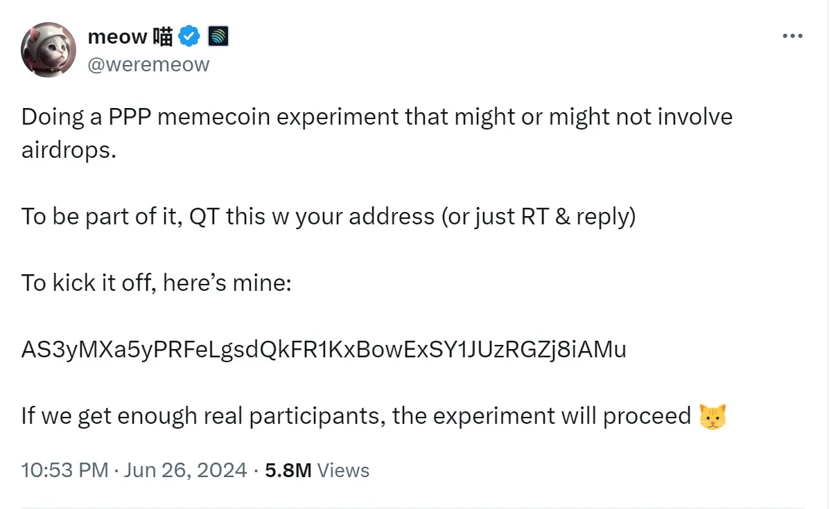 这一实验本身并不足为奇, Jupiter 社区热爱 meme , Meow 也多次表示希望 meme 热度一直持续下去,并且提出了 PPP 概念( Player pump player ,及最后一名参与者获胜),也在不断尝试新手段推进 PPP 。