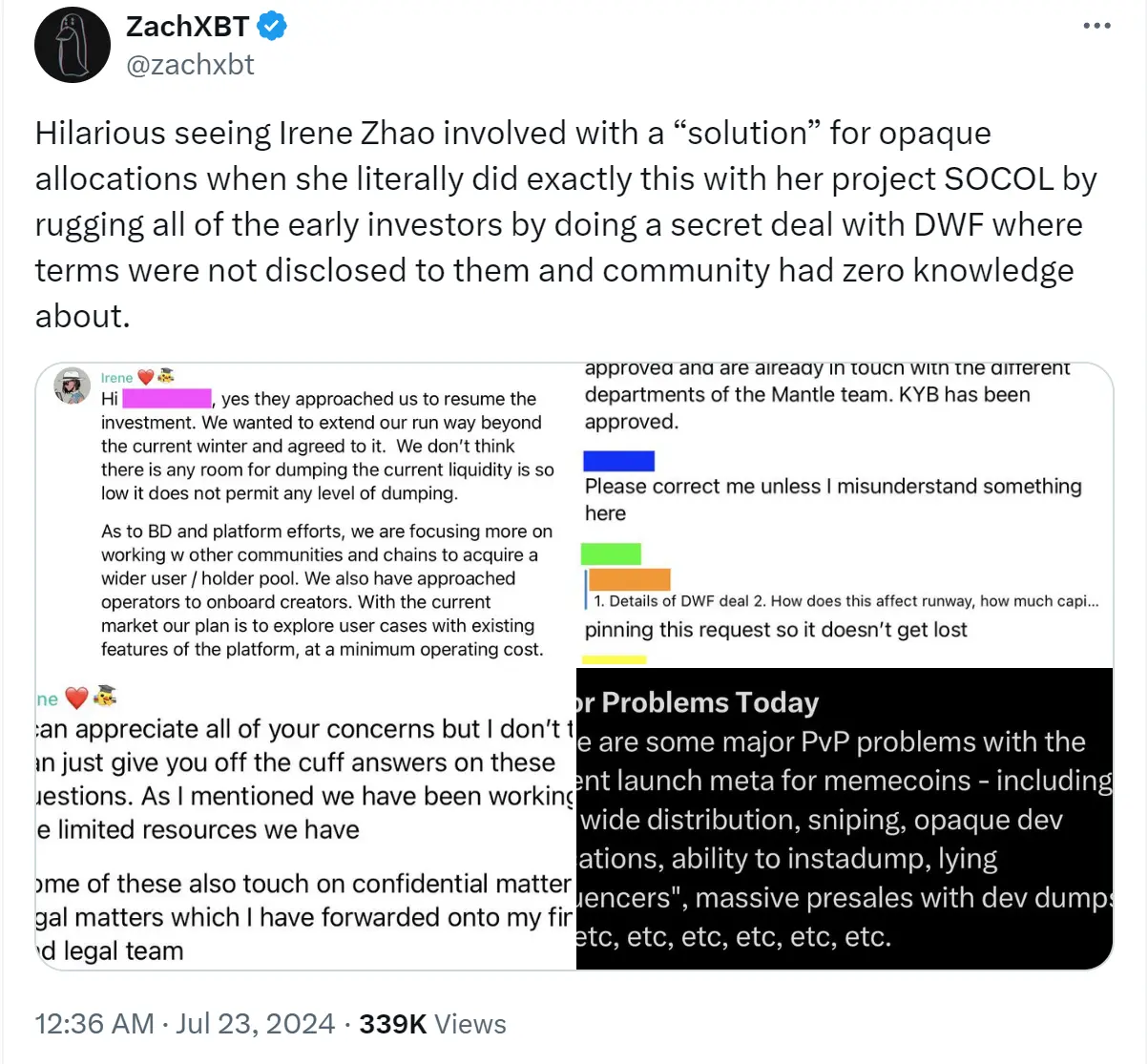 7 月 23 日, Jupiter 联合创始人 Meow 在社交媒体发文表示,将与 Irene Zhao 合作推出 meme 币元数据平台 Asian mom ,并且 Jupiter DAO 将获得 5% 的 Asian mom 代币。然而这一实验的合作方, Irene Zhao 却被 ZachXBT 指出曾参与多个项目诈骗。