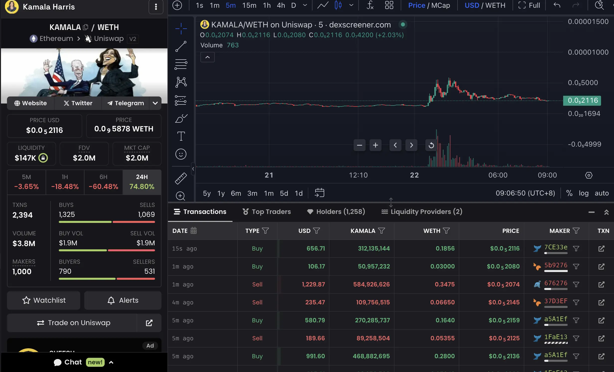 以太坊上还有一个$KAMALA,也一定程度上分流了一些$HERRIS 的流动性,目前市值为$2M 美元。
