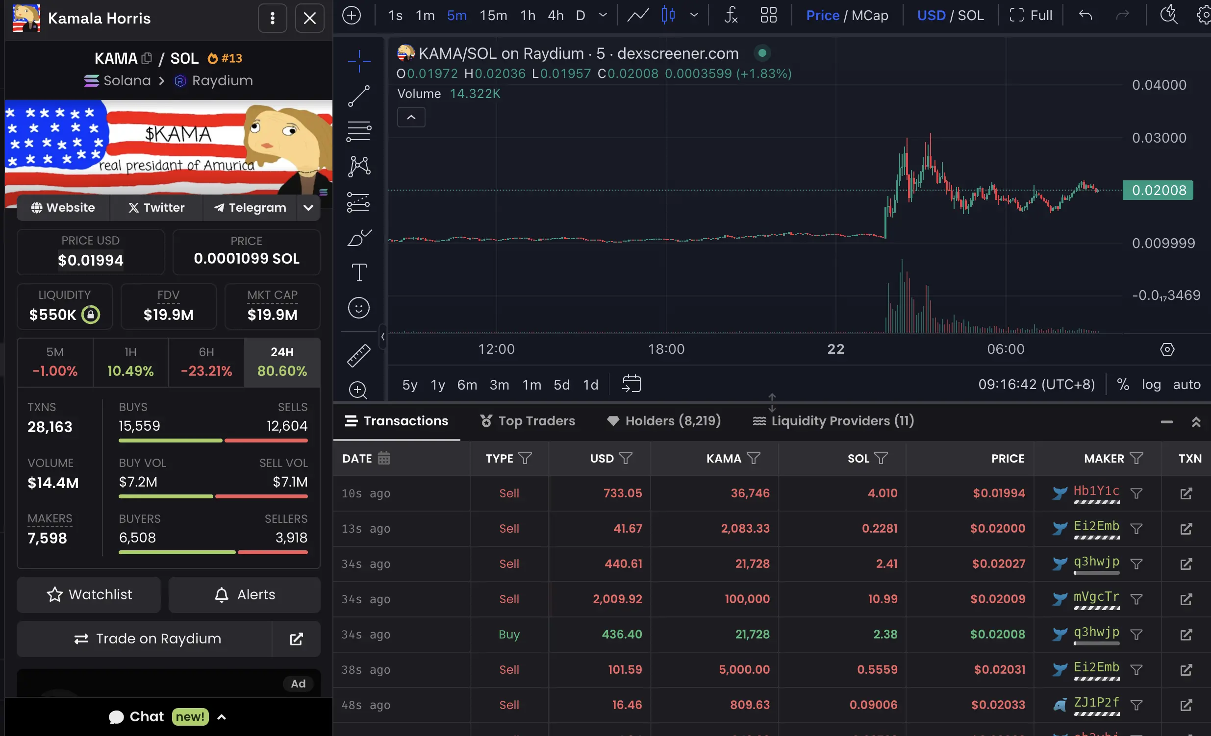 $KAMA 是 SOLANA 链上的,在拜登宣布退选后的几分钟内价格翻倍,上涨突破 0.0257 美元,创下历史新高,现报价 0.01718 美元,24 小时涨幅为 55%。目前市值也是最大的,达$20M 美元,几乎是之前以拜登为灵感的币 BODEN 的四倍。