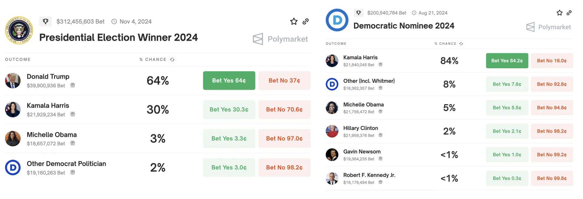 例如,下图左边显示了 2024 年总统选举的获胜者目前的胜率情况:唐纳德·特朗普的胜率为 63%,赌注总额达 39,900,936 美元;卡玛拉·哈里斯的胜率上升至 30%,赌注达 21,929,234 美元;米歇尔·奥巴马的胜率为 3%,赌注达到 18,657,072 美元。