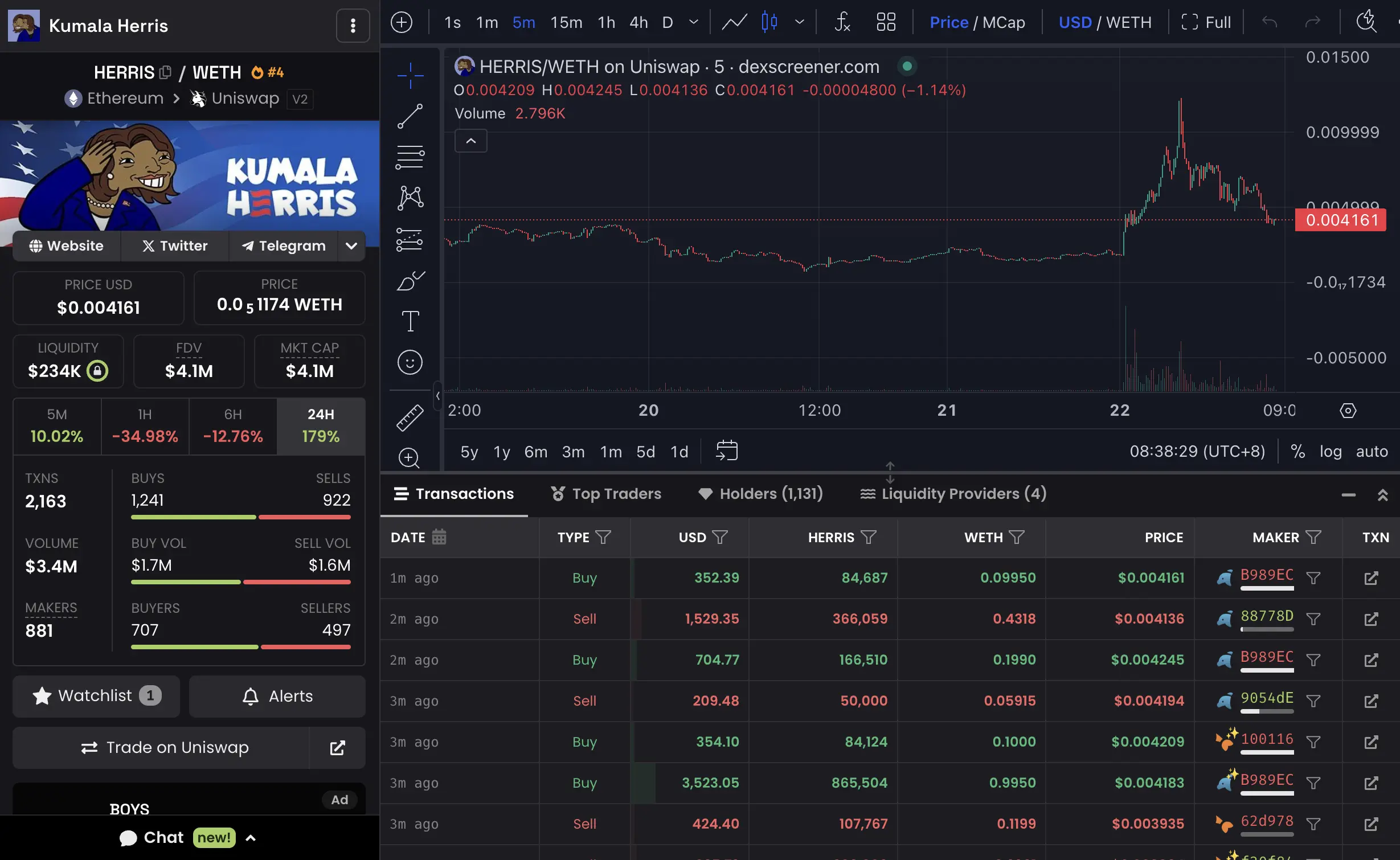 目前,这是以太坊链上共识度最高的哈里斯相关概念币,市值也是目前以太坊链上最大的,目前为$4.1M 美元。在拜登宣布退选后,$HERRIS 价格达到新高 0.012 美元,市值一度接近 10 亿美元,但随后出现了大幅回撤。